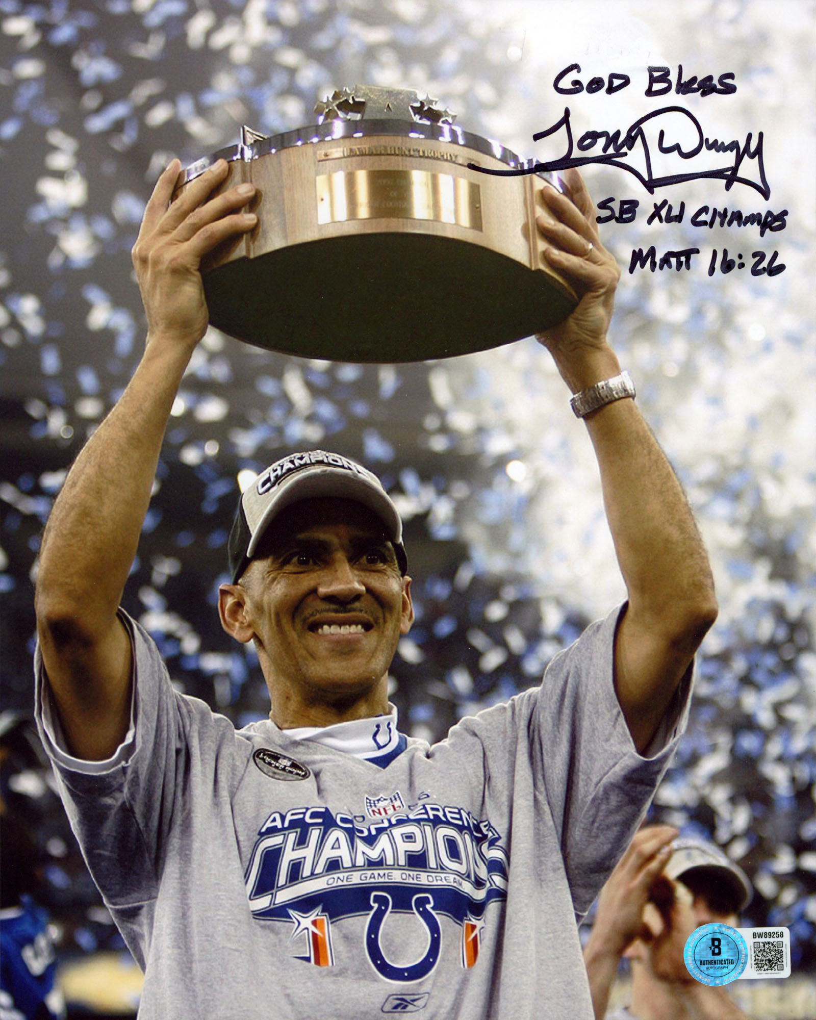 This Autographed Vertical 8x10 Photo with the inscription of "God Bless SB XLI Champs Matt 16:26" has been Personally Signed by Tony Dungy of the Indianapolis Colts. This item is 100% Authentic to include a hologram by Beckett Authentication Services. This item will come with an affixed Beckett Authentication Services (BAS) authentication sticker, which includes a scannable QR code to verify authenticity. Please note that Beckett no longer provides serial-numbered COA cards, and the attached BAS sticker will serve as the complete authentication for this item. We have multiples of this same item. While the photographs are representative of this item, the size, placement and strength of the signature may vary. Each item is hand signed, therefore, each autograph is unique.