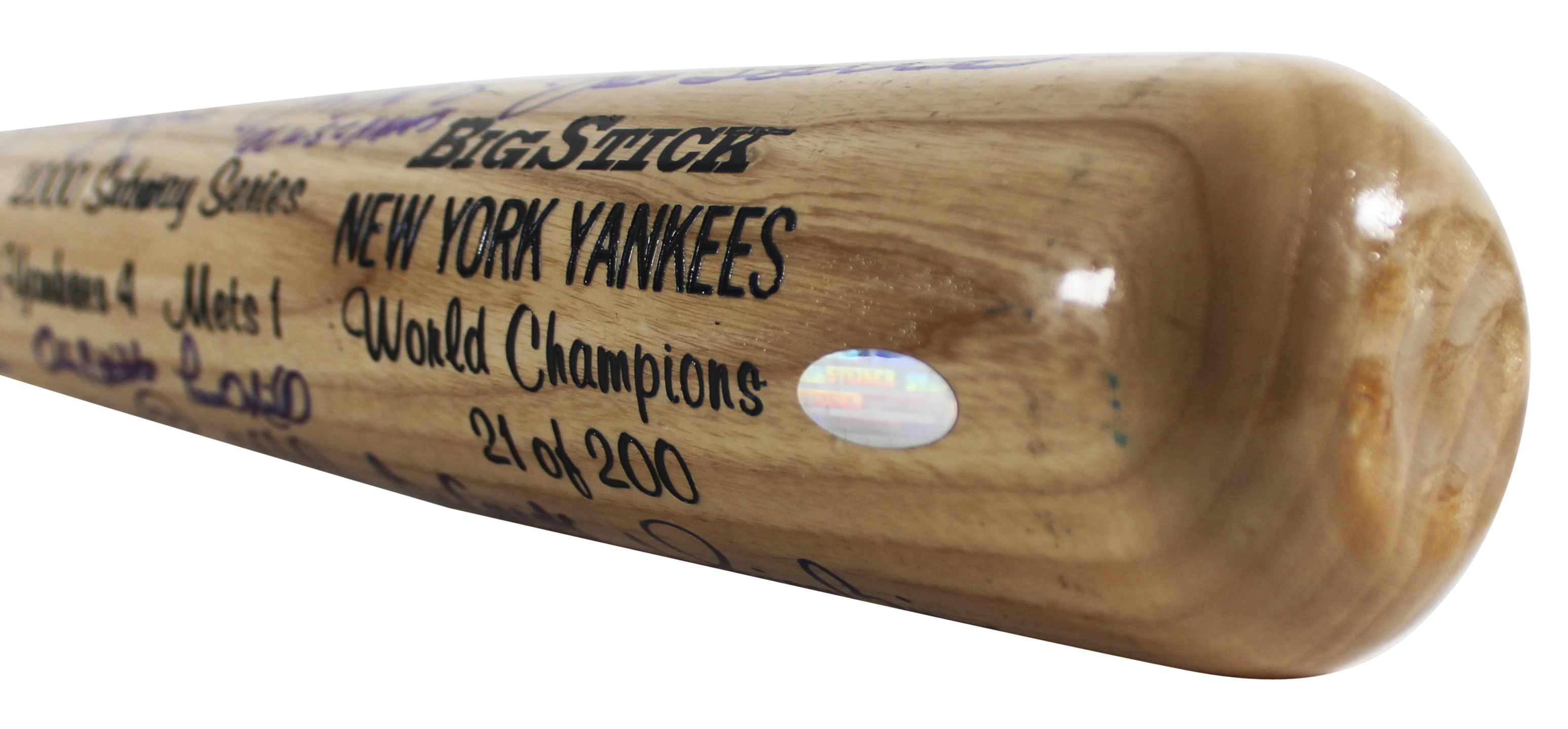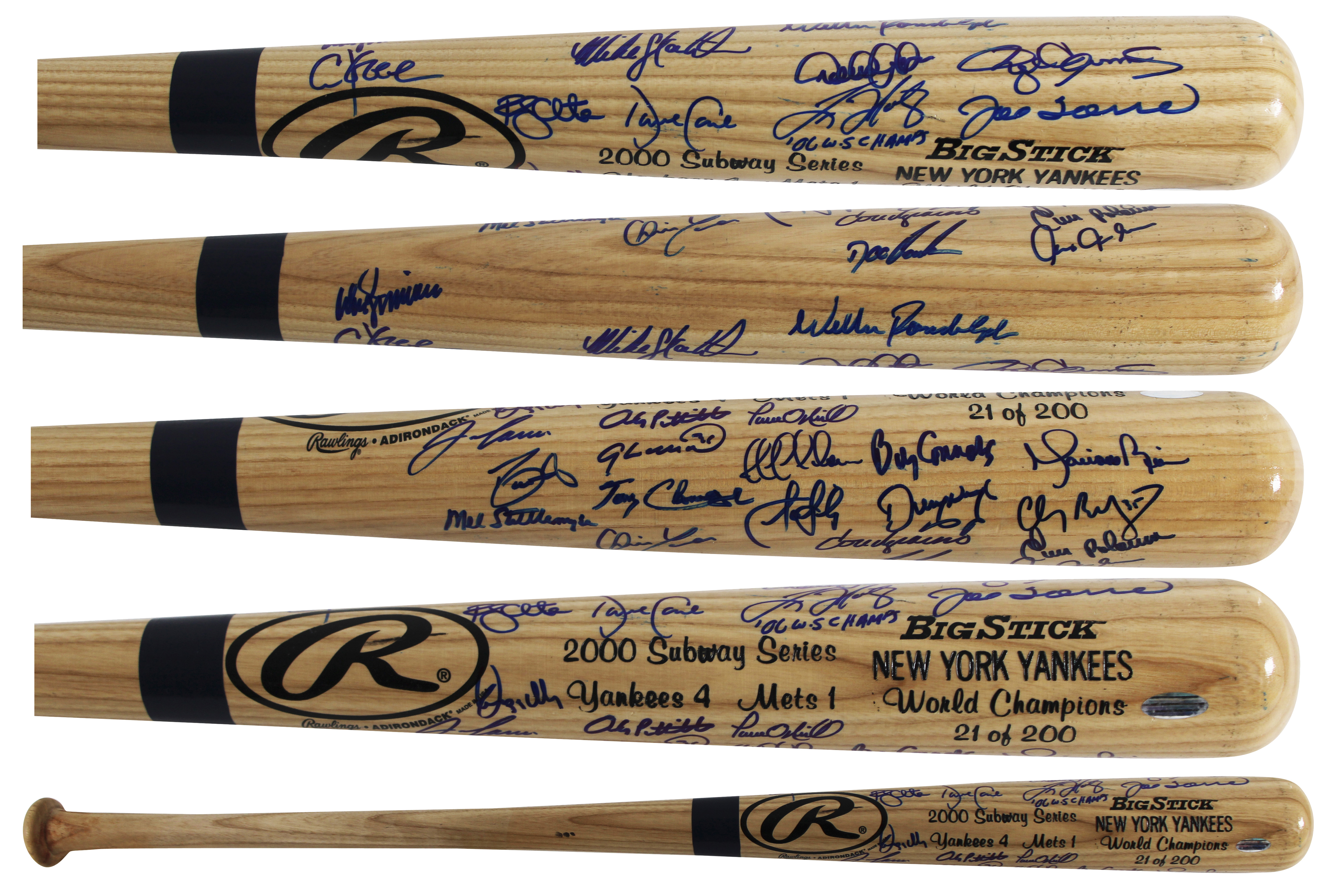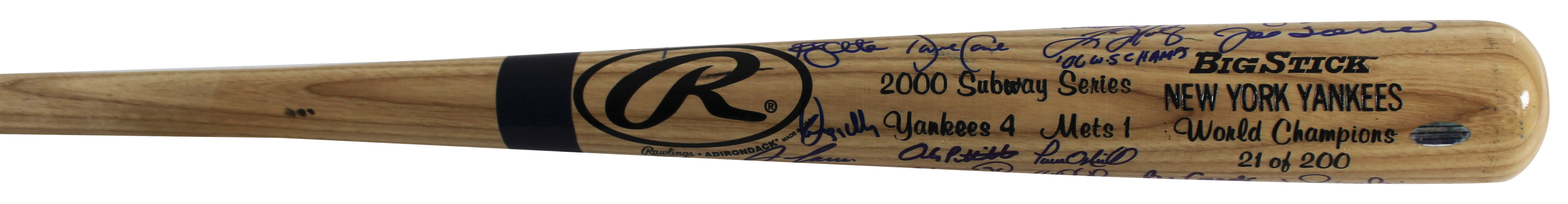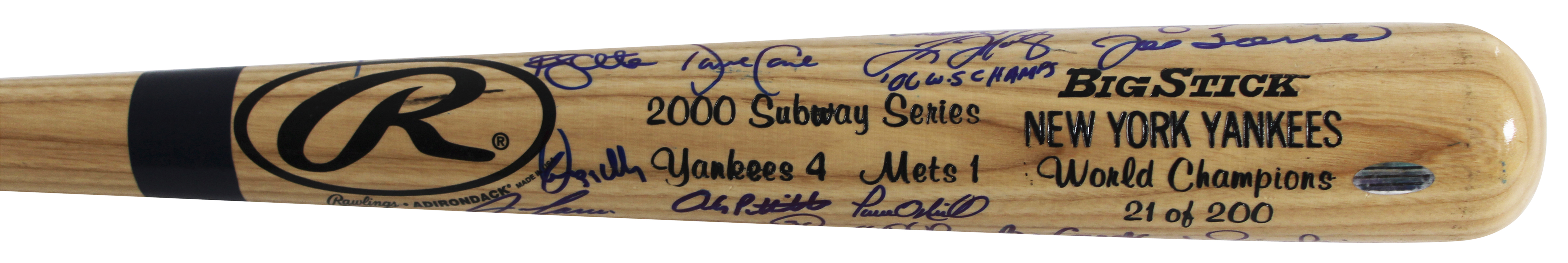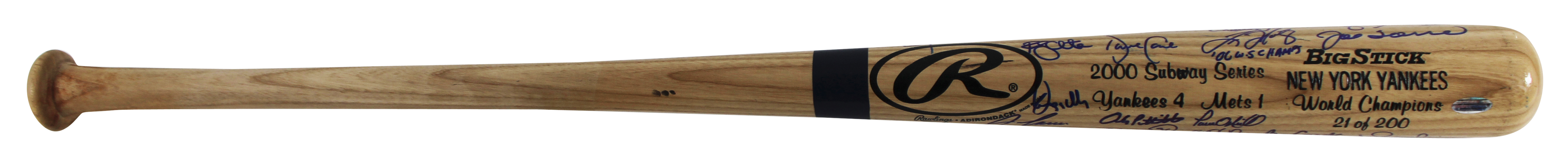 This Autographed Limited Edition #21/200 2000 Subway Series Rawlings Big Stick Baseball Bat has been Personally Signed by Joe Torre, Derek Jeter, Mariano Rivera, Roger Clemens, David Cone, Randy Choate, Dwight Gooden, Denny Neagle, Jeff Nelson, Andy Pettitte, Mike Stanton, Mel Stottlemyre, Willie Randolph, Don Zimmer, Luis Polonia, Paul O'Neill, Jose Canseco, Chuck Knoblauch, Chris Turner, Tino Martinez, Clay Bellinger & 7 More of the New York Yankees. This item is 100% Authentic to include a hologram by Beckett Authentication Services. This item will come with an affixed Beckett Authentication Services (BAS) authentication sticker, which includes a scannable QR code to verify authenticity. Please note that Beckett no longer provides serial-numbered COA cards, and the attached BAS sticker will serve as the complete authentication for this item. The authenticity can be verified on Beckett Authentication Services website.