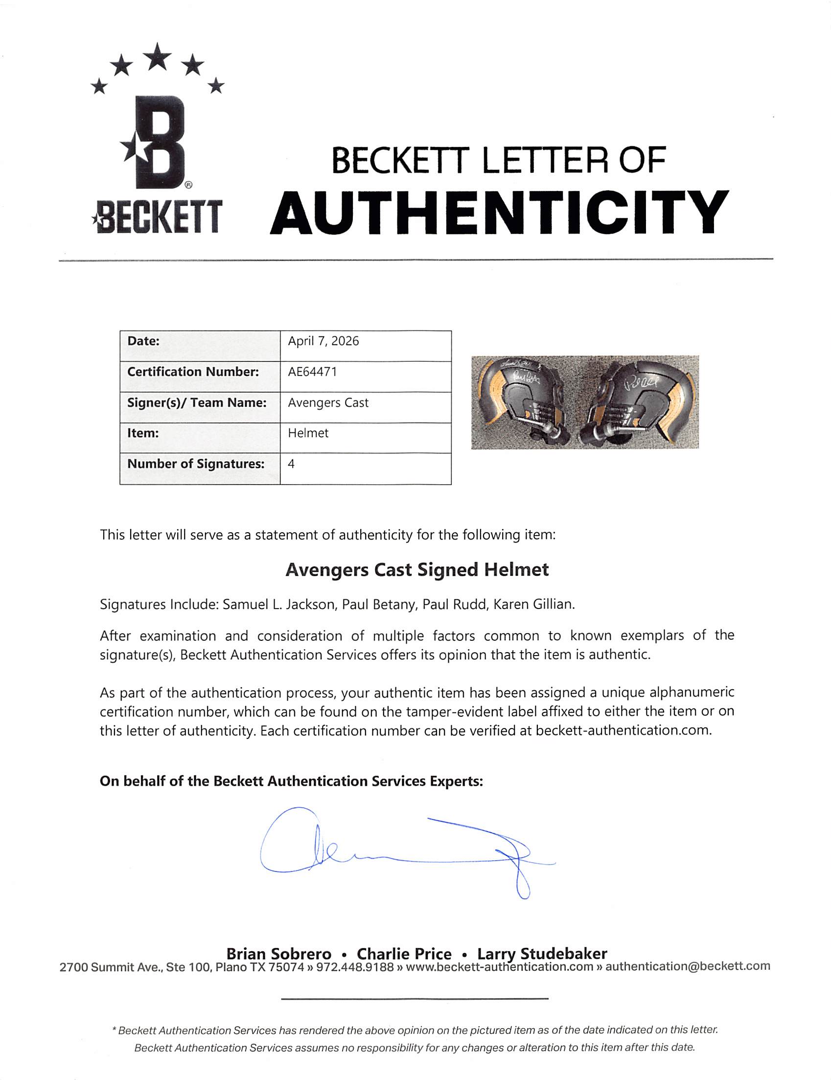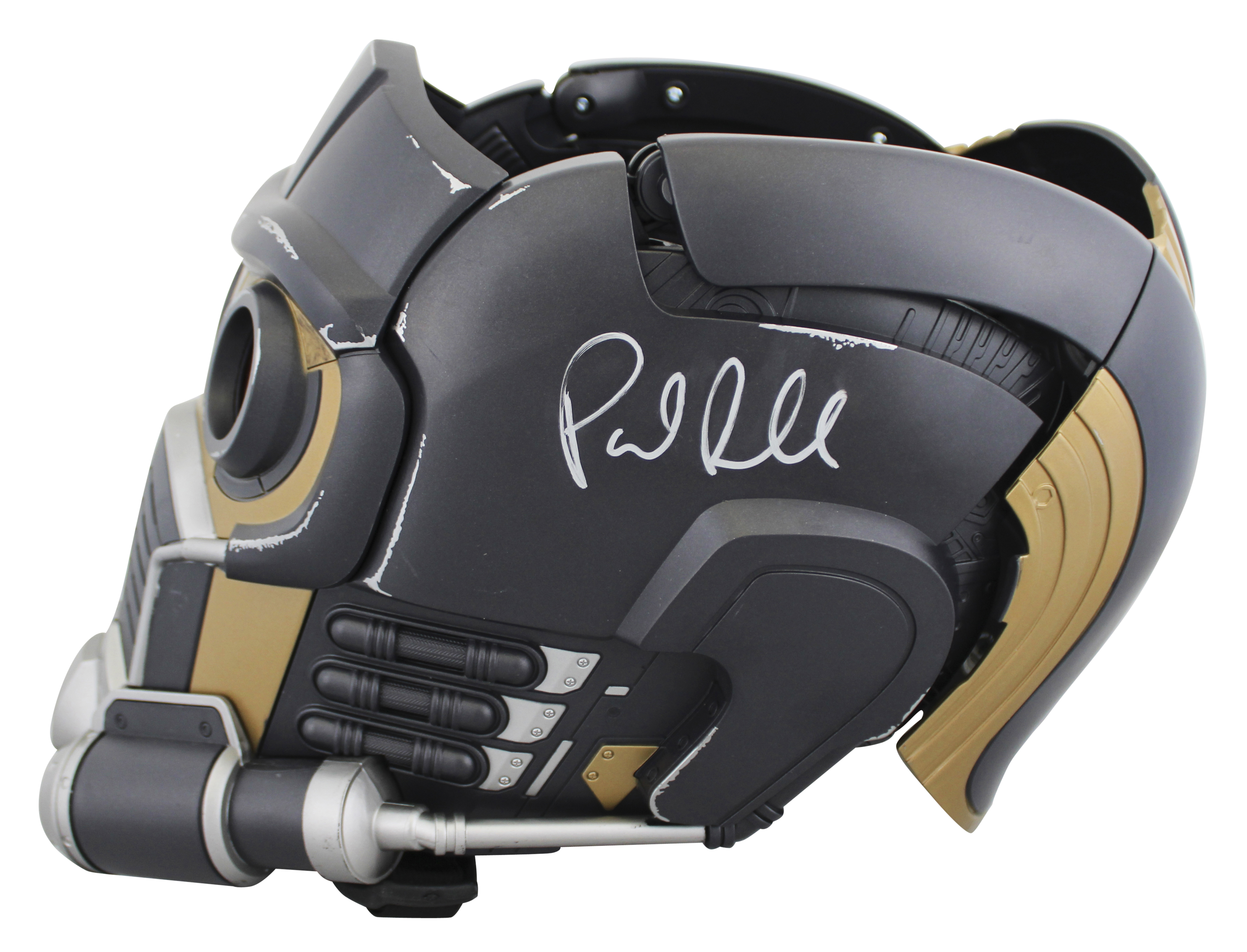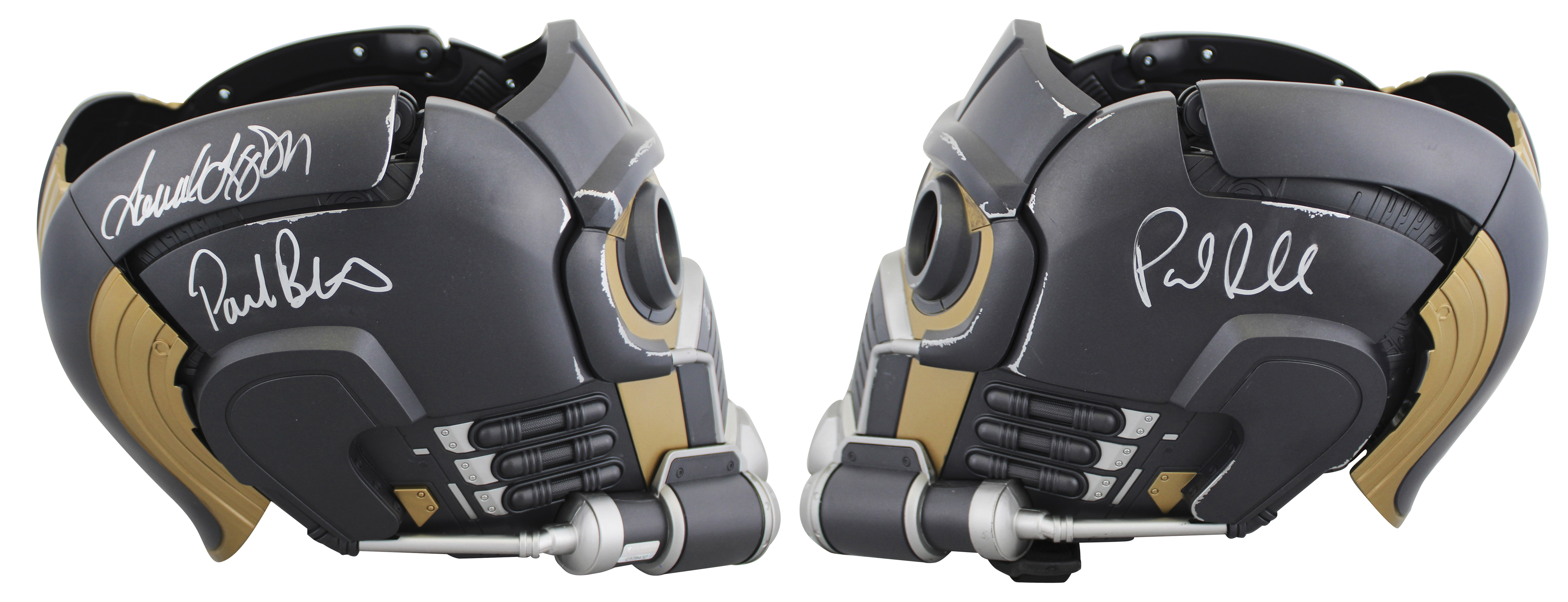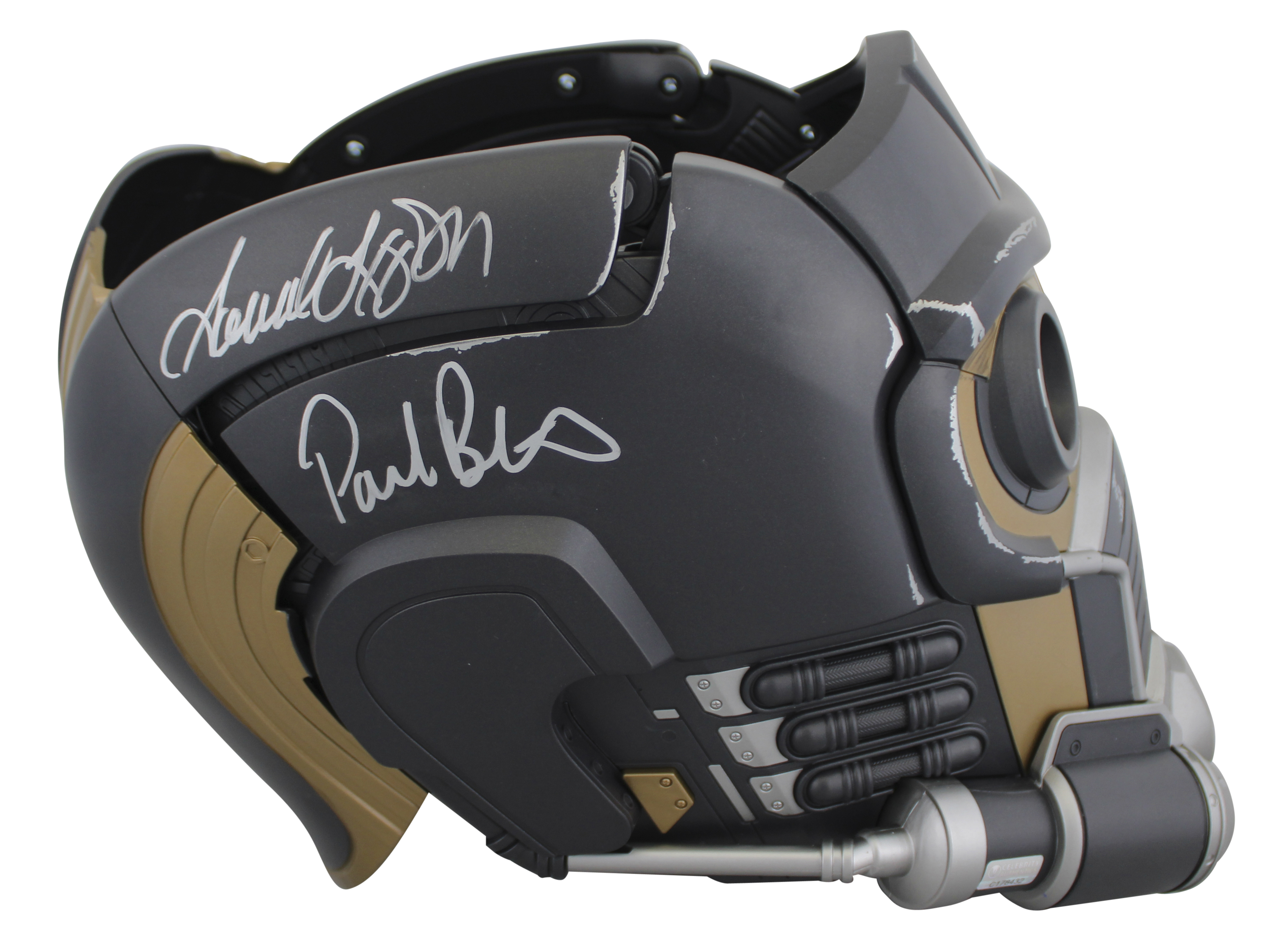 This Autographed Star-Lord Full Size Rep Helmet has been Personally Signed by Samuel L. Jackson, Paul Betany, Paul Rudd & Karen Gillian of The Avengers. This item is 100% Authentic to include a hologram by Beckett Authentication Services. This item will come with an affixed Beckett Authentication Services (BAS) authentication sticker, which includes a scannable QR code to verify authenticity. Please note that Beckett no longer provides serial-numbered COA cards, and the attached BAS sticker will serve as the complete authentication for this item. We have multiples of this same item. While the photographs are representative of this item, the size, placement and strength of the signature may vary. Each item is hand signed, therefore, each autograph is unique.