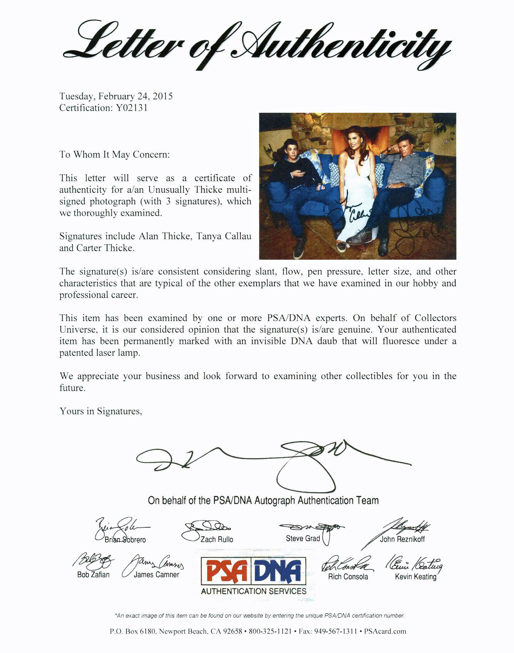 This is a Authentic Signed 8X10 Photo that has been Personally Signed & Autographed by Alan Thicke, Carter Thicke & Tanya Callau. This item is 100% Authentic to include a Certificate of Authenticity (COA) / hologram by PSA/DNA #Y02131.Press Pass Collectibles offers a 100% Lifetime Guarantee on all Autographed & Signed Alan Thicke, Carter Thicke & Tanya Callau memorabilia.