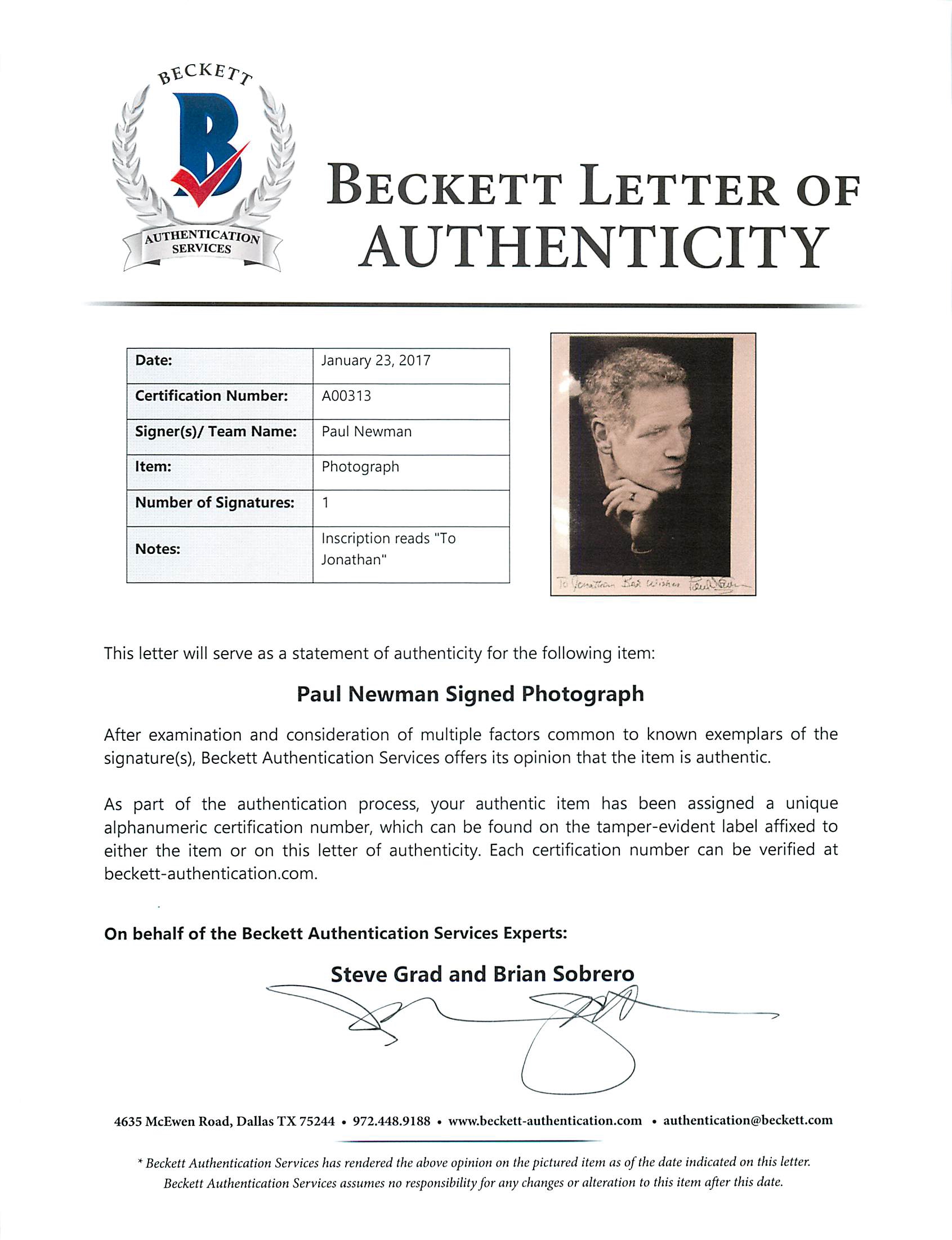 This is a "To Jonathan Best Wishes" Authentic Signed 8X10 Photo that has been Personally Signed & Autographed by Paul Newman. This item is 100% Authentic to include a Certificate of Authenticity (COA) / hologram by BAS #A00313.Press Pass Collectibles offers a 100% Lifetime Guarantee on all Autographed & Signed Paul Newman memorabilia. Industry-Leading Autograph Experts Unite with an Iconic Hobby Brand: Introducing Beckett Authentication Services (BAS)The most respected autograph authentication experts in the world have teamed up with one of the most respected brands in collectibles. Beckett Authentication Services (BAS) is led by renowned autograph expert Steve Grad of Pawn Stars fame, who has spent the last 15 years as the principal authenticator for PSA/DNA. During his tenure, Grad used his expertise not only to build the brand and reputation of PSA/DNA, but also to help establish third party authentication as a universally accepted and respected practice in the hobby. Grad has examined and authenticated some of the finest autographed relics to ever surface in the market, and his opinion is regarded as the "gold standard" among collectors, dealers and auction houses across the world. Since 2013, Grad has also served as an autograph expert for Pawn Stars on The History Channel, and will continue to appear on the popular show representing BAS. Joining Grad on the BAS authentication team is Brian Sobrero. An authenticator with PSA/DNA since 2009, Sobrero's extensive experience in the autograph business combined with his unique skill set have quickly propelled him to becoming one of the most respected opinions in the autograph industry. Together, the team of Steve Grad and Brian Sobrero, combined with Beckett --a pillar of integrity in the collectibles marketplace -- makes Beckett Authentication Services the new leading force in autograph authentication.