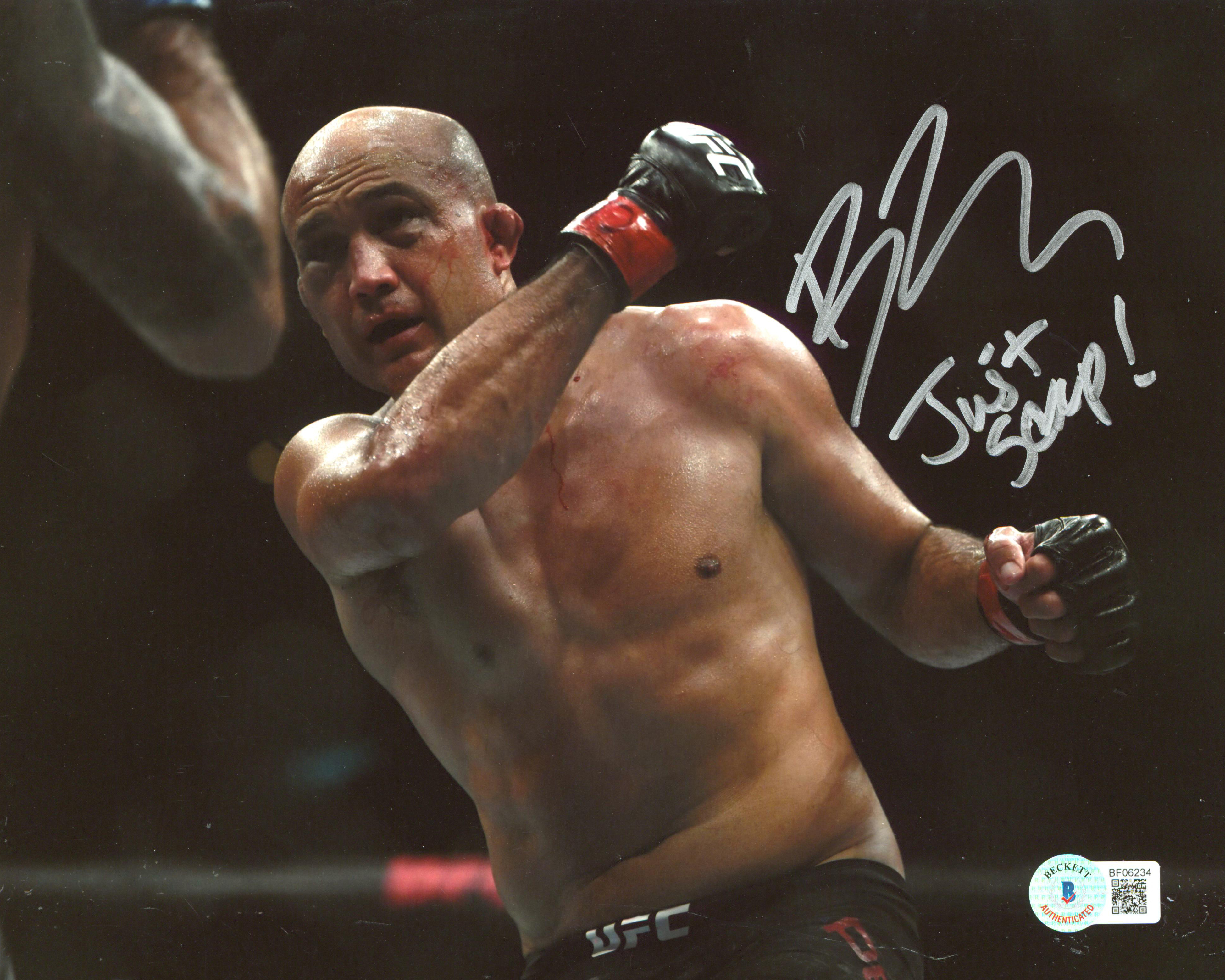 This Autographed 8x10 Photo with the inscription of "Just Scrap!" has been Personally Signed by B.J. Penn of the Ultimate Fighting Championship. This item is 100% Authentic to include a hologram by Beckett Authentication Services. This item will come with an affixed Beckett Authentication Services (BAS) authentication sticker, which includes a scannable QR code to verify authenticity. Please note that Beckett no longer provides serial-numbered COA cards, and the attached BAS sticker will serve as the complete authentication for this item. The authenticity can be verified on Beckett Authentication Services website.