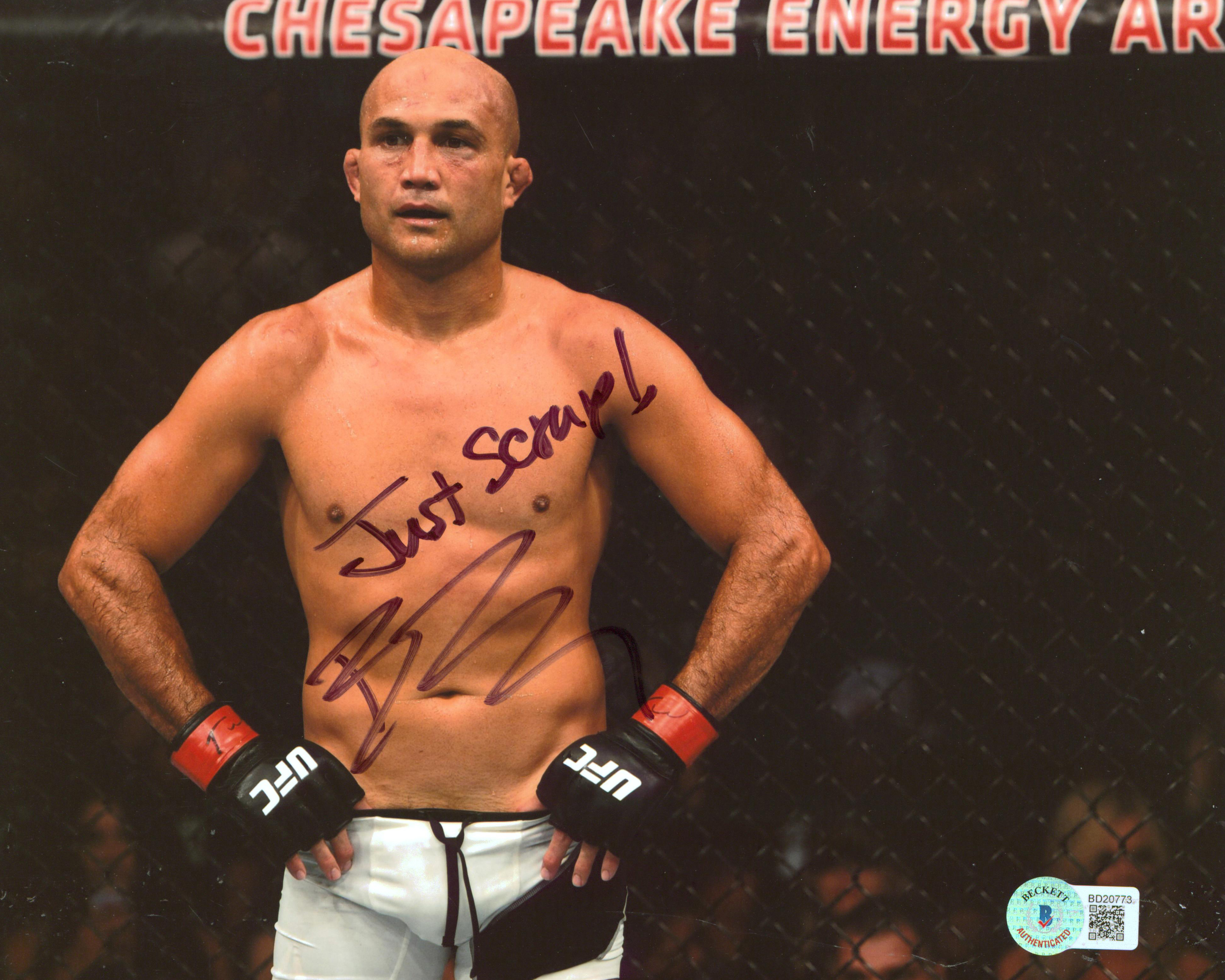 This Autographed 8x10 Photo with the inscription of "Just Scrap!" has been Personally Signed by B.J. Penn of the Ultimate Fighting Championship. This item is 100% Authentic to include a Certificate of Authenticity (COA) / hologram by Beckett Authentication Services. The authenticity can be verified on Beckett Authentication Services website.