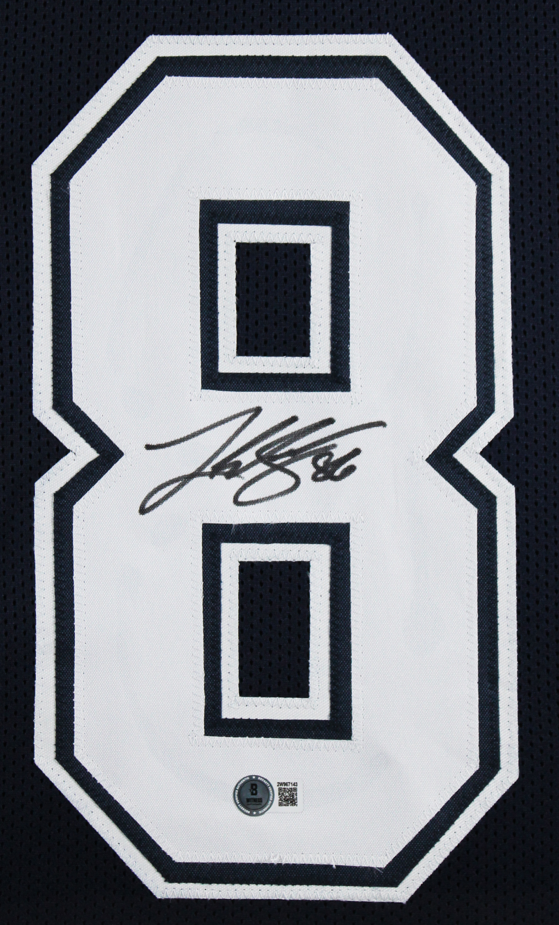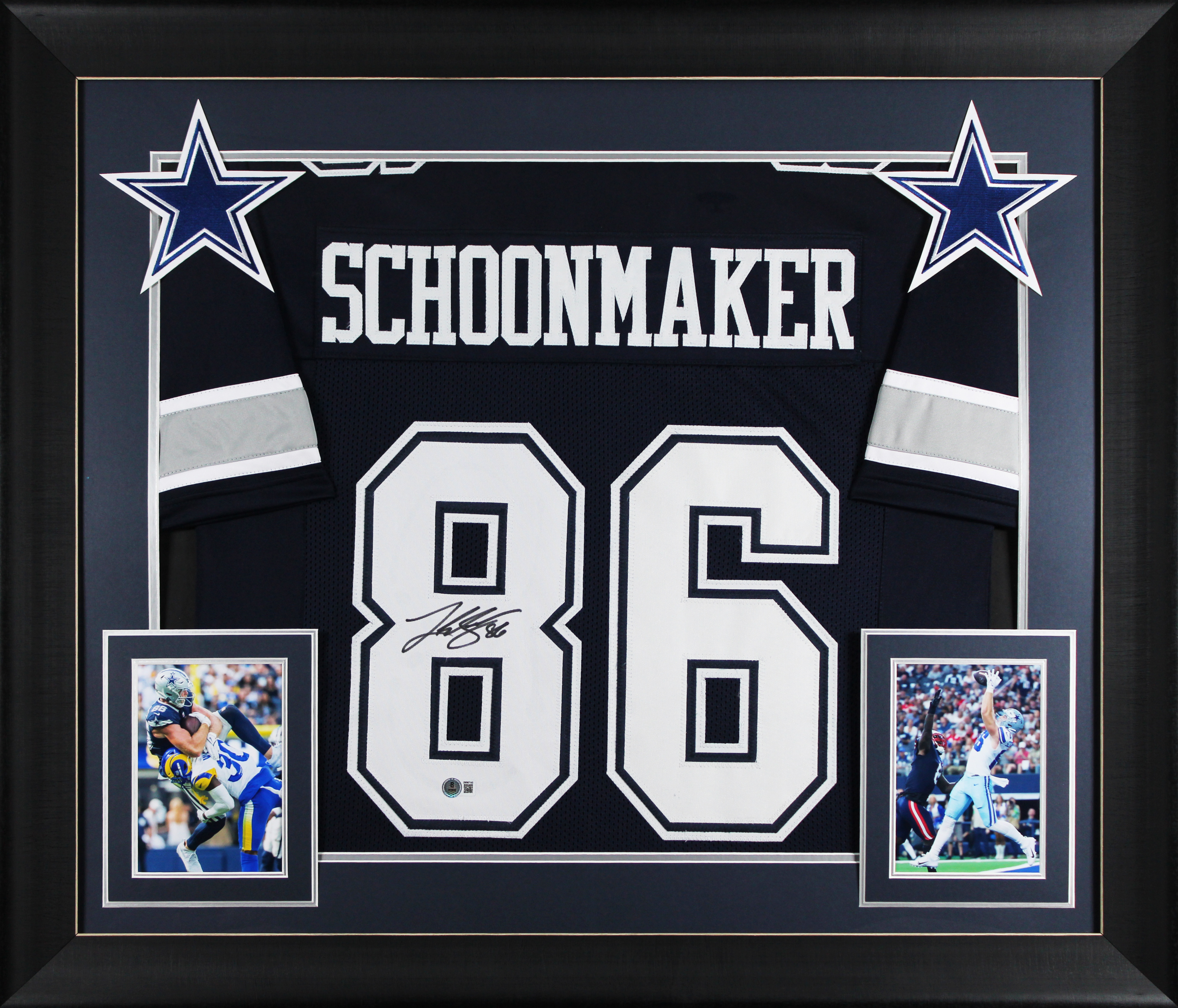 This Autographed Navy Pro Style Framed Jersey has been Personally Signed by Luke Schoonmaker of the Dallas Cowboys. This item is 100% Authentic to include a hologram by Beckett Authentication Services. This item will come with an affixed Beckett Authentication Services (BAS) authentication sticker, which includes a scannable QR code to verify authenticity. Please note that Beckett no longer provides serial-numbered COA cards, and the attached BAS sticker will serve as the complete authentication for this item. This is a BAS Witnessed Protection Program item which means a Beckett Authentication Service representative was present when this item was being signed. We conducted an autograph signing with Luke Schoonmaker where multiples of the same item were signed. While the photographs are representative of this item, the size, placement and strength of the signature may vary. Each item is hand signed, therefore, each autograph is unique. This item can be verified through BAS Witnessed. This item has been professionally framed to overall dimensions of approximately 32 x 37 inches. This is a X-Large sized, non-branded, custom-stitched Framed Jersey. This jersey will be framed to order, it will take approximately 4-5 business days from purchase date before it will ship.