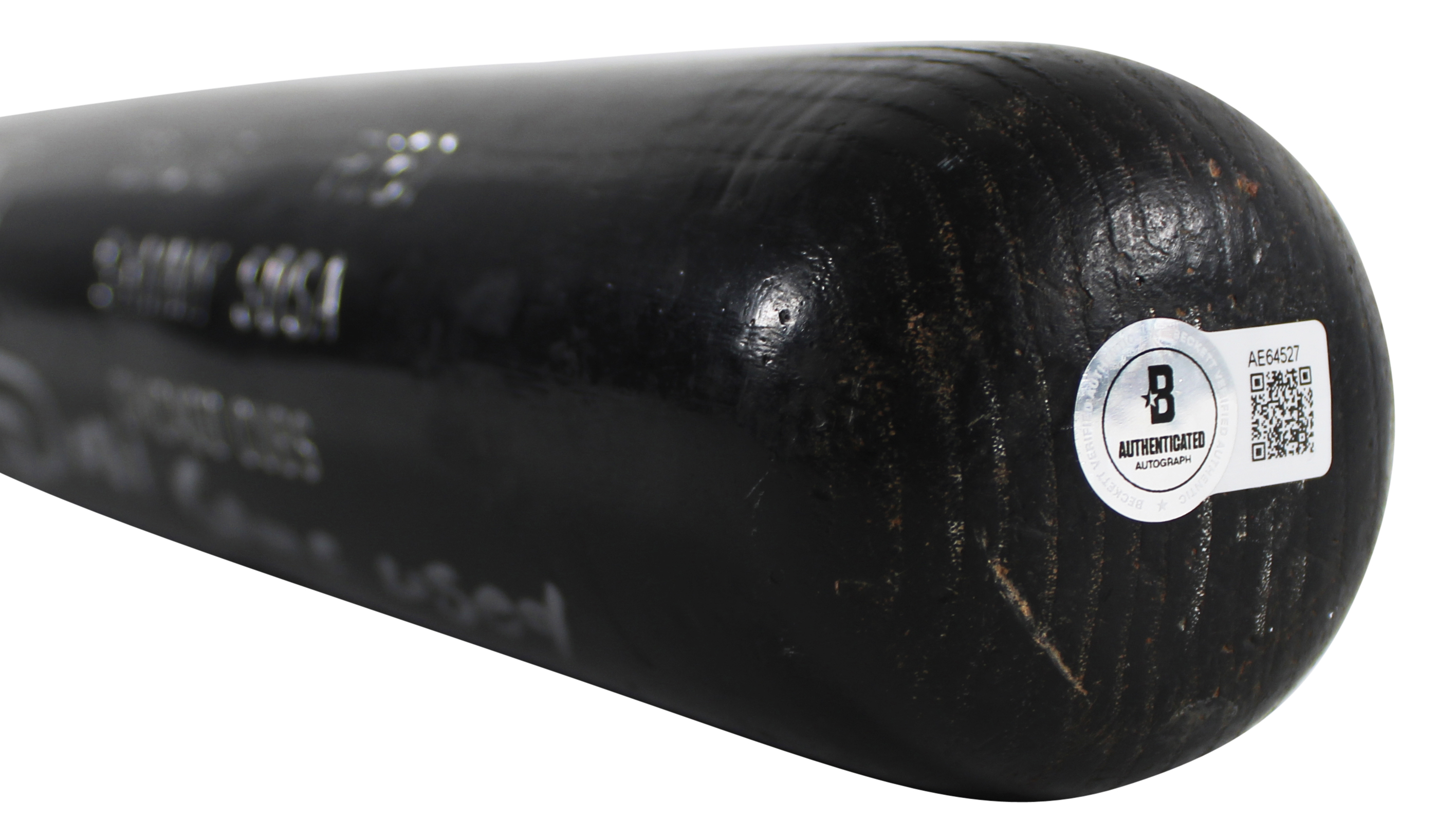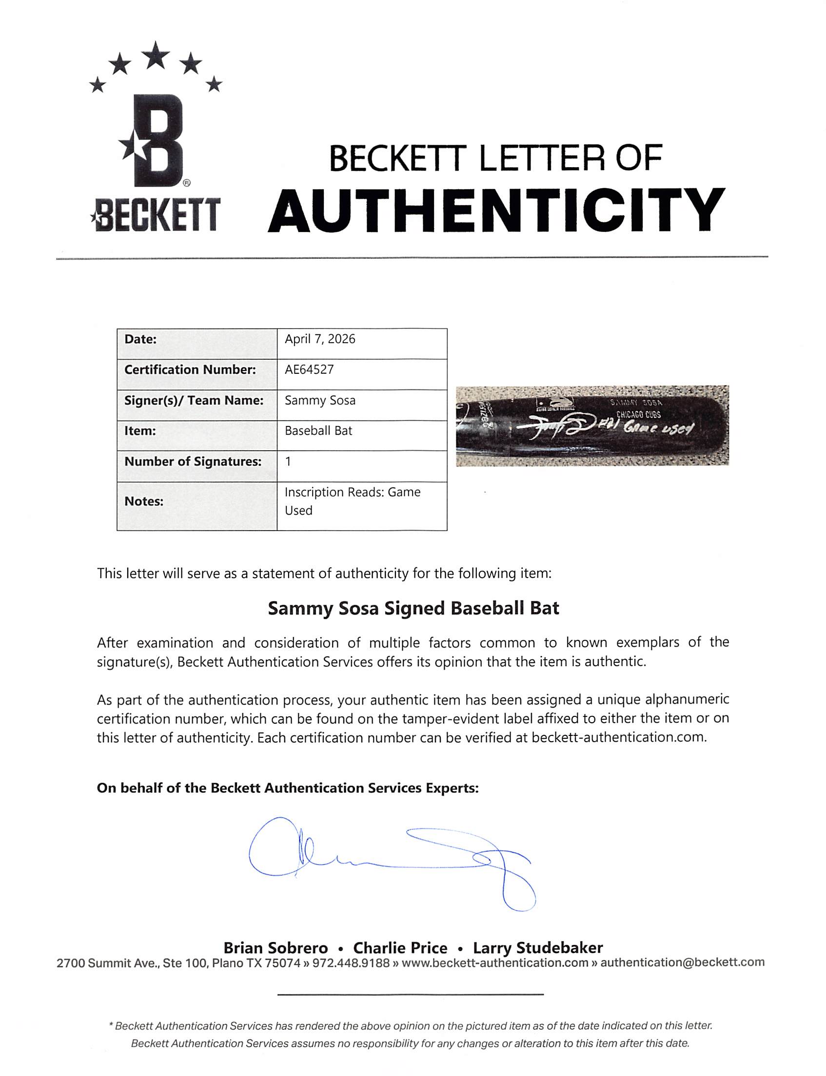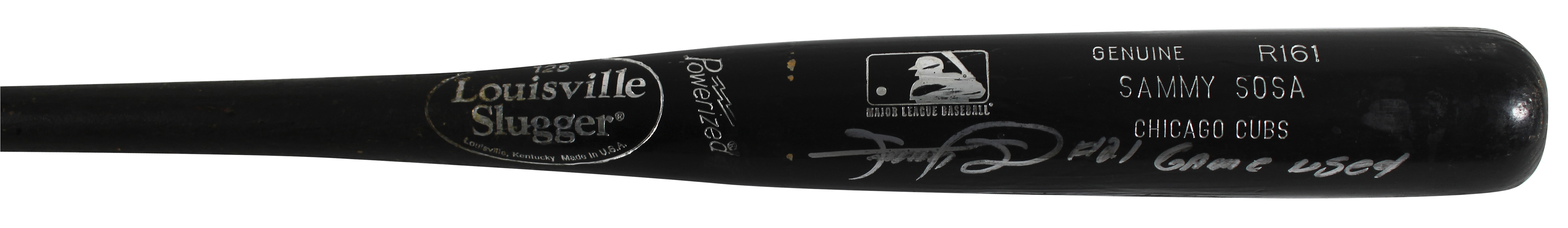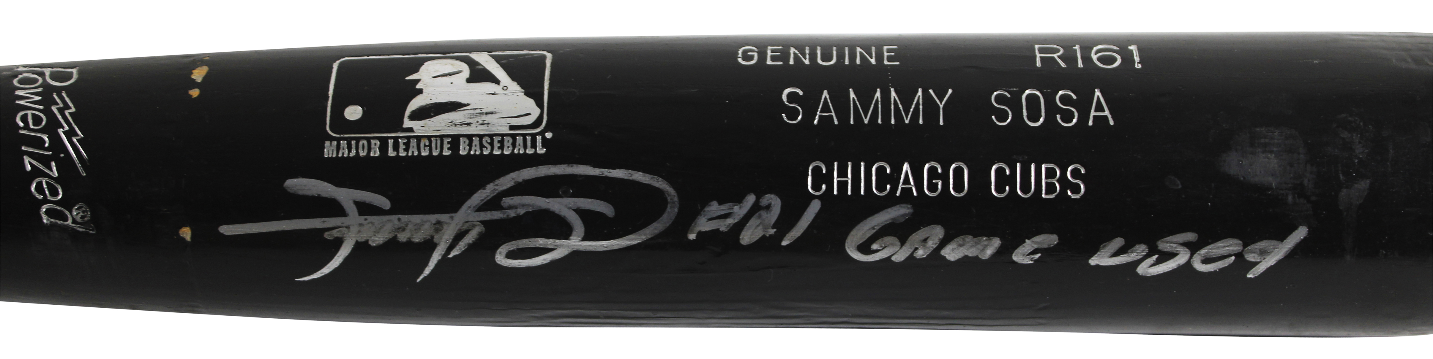 This Autographed Cracked Game Used Louisville Slugger Player Model Baseball Bat with the inscription of "Game Used" has been Personally Signed by Sammy Sosa of the Chicago Cubs. This item is 100% Authentic to include a Certificate of Authenticity (COA) / hologram by Beckett Authentication Services. The authenticity can be verified on Beckett Authentication Services website. The bat has all of the hallmarks of being a well used game bat. Sammy has inscribed it game used, however it does not have any additional paperwork for the game use.