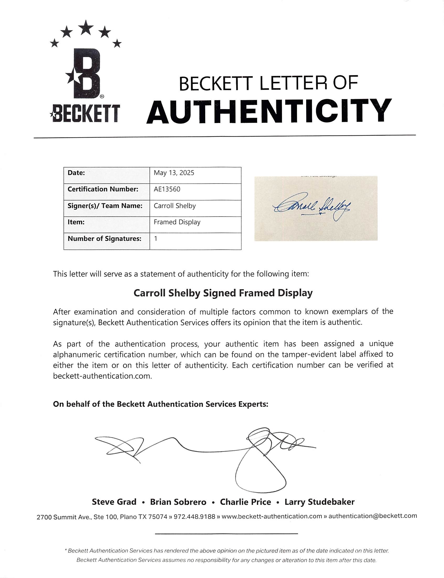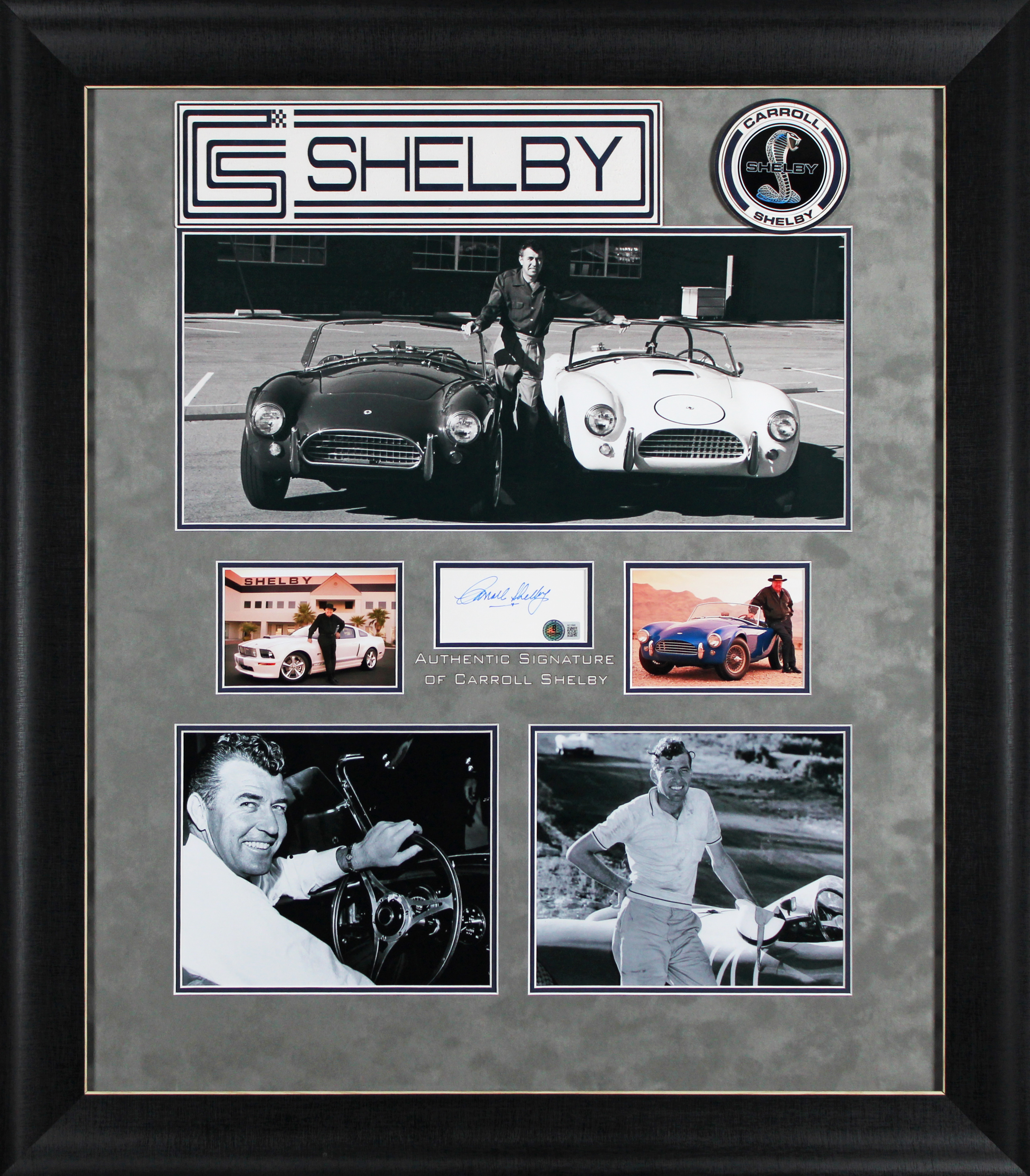 This Autographed 2x4 Cut Signature Framed Display has been Personally Signed by Carroll Shelby. This item is 100% Authentic to include a Certificate of Authenticity (COA) / hologram by Beckett Authentication Services. The authenticity can be verified on Beckett Authentication Services website. This item has been professionally framed to overall dimensions of approximately 28.5 x 32.5 inches.