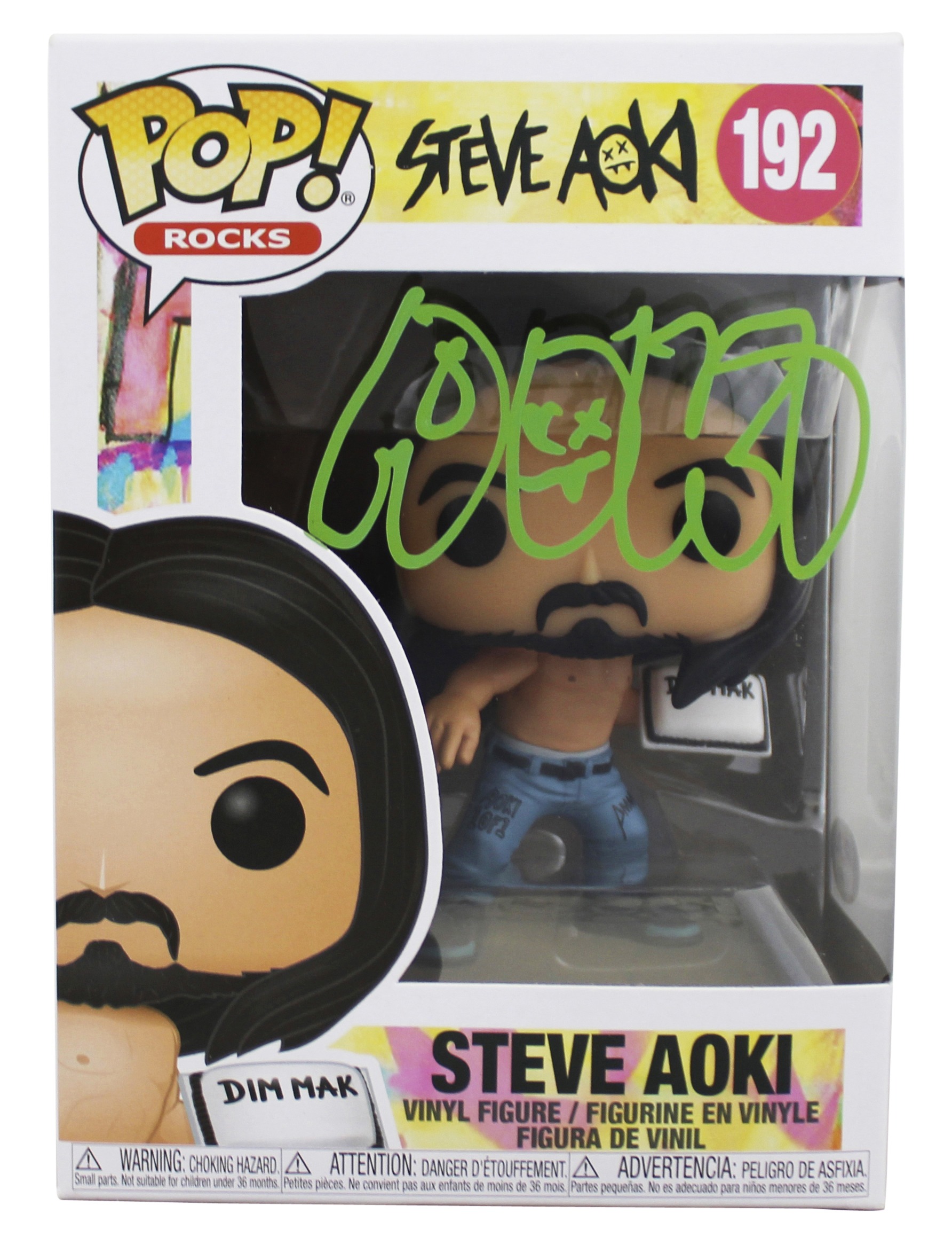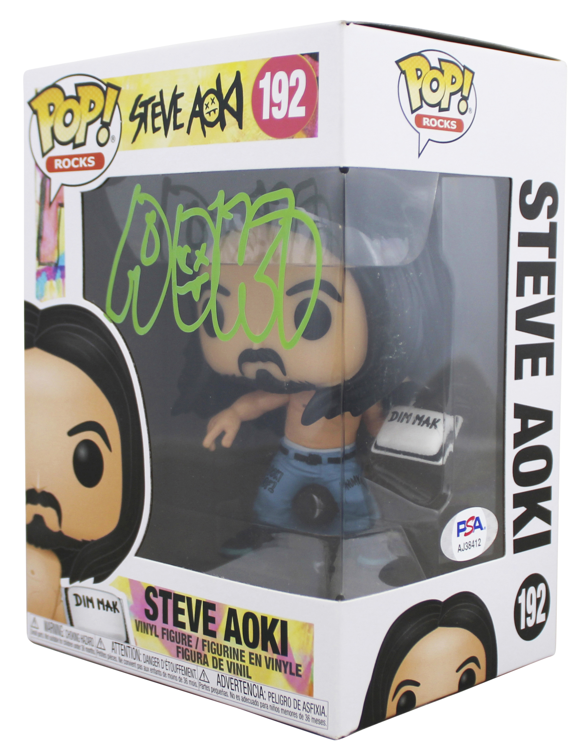 This Autographed Steve Aoki #192 Funko Pop Vinyl Figure has been Personally Signed by Steve Aoki. This item is 100% Authentic and comes with a PSA/DNA Certification Card and a matching numbered Hologram. The authenticity can be verified on Professional Sports Authenticator website. This will be shipped in a Pop Protector. This Funko will have some handling wear from shipment to the signing and back. Please refer to pictures for item's condition prior to purchase.
