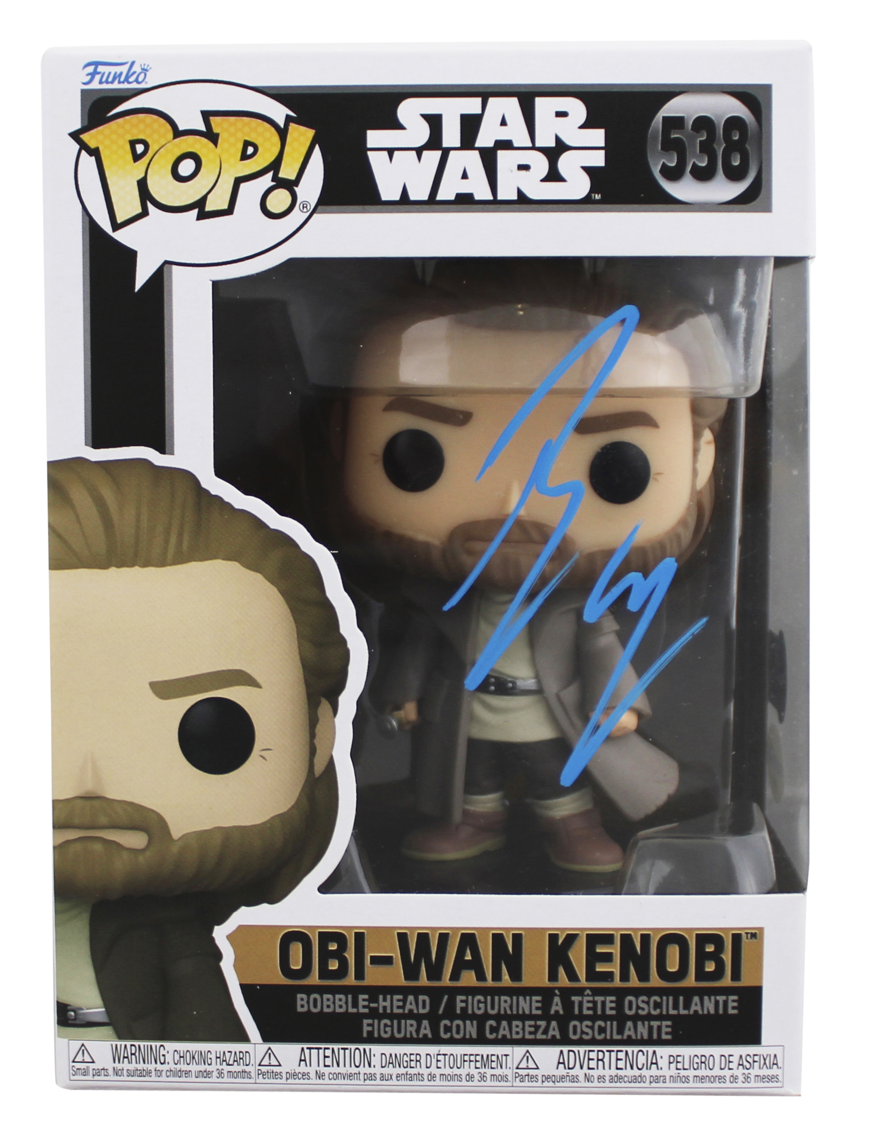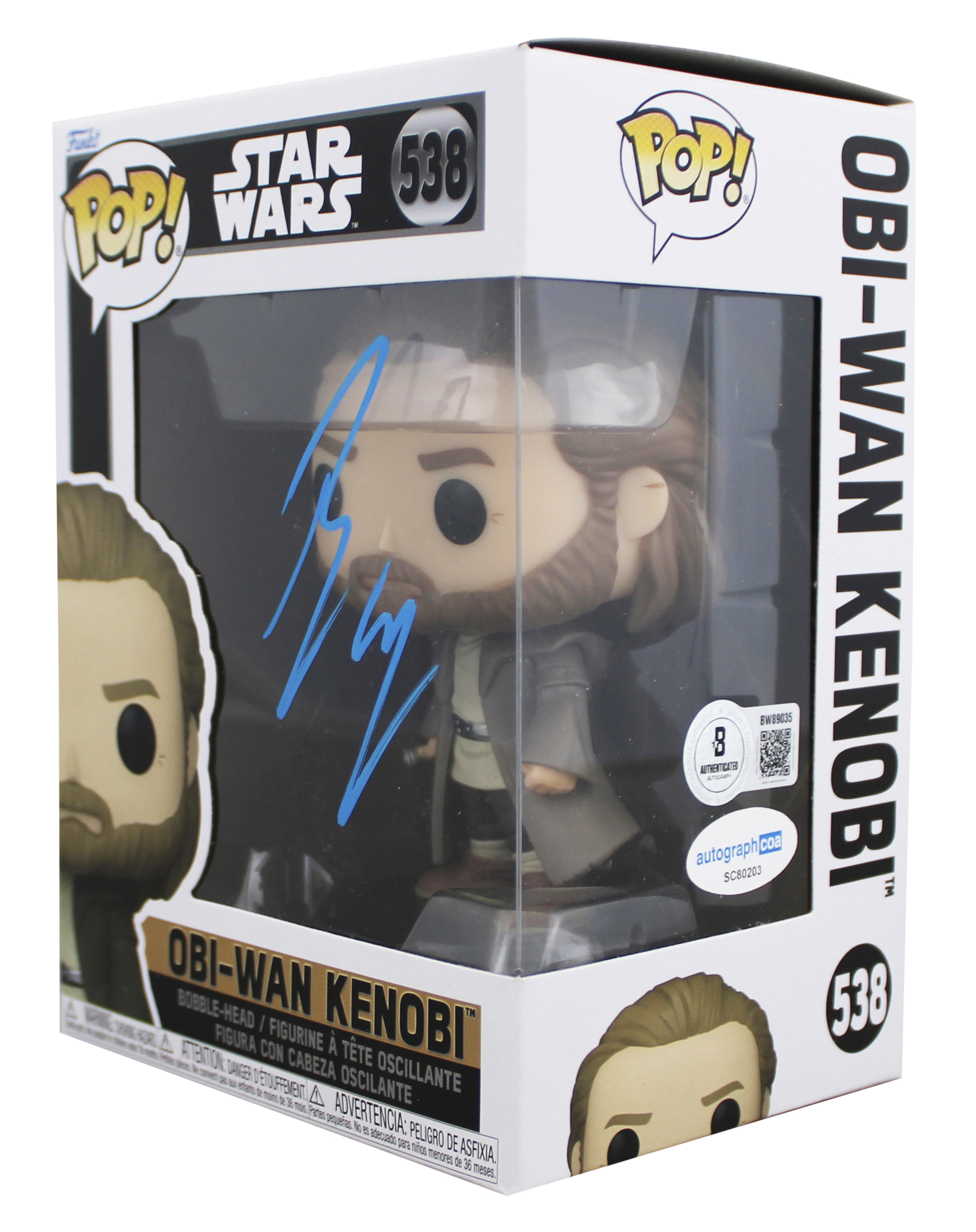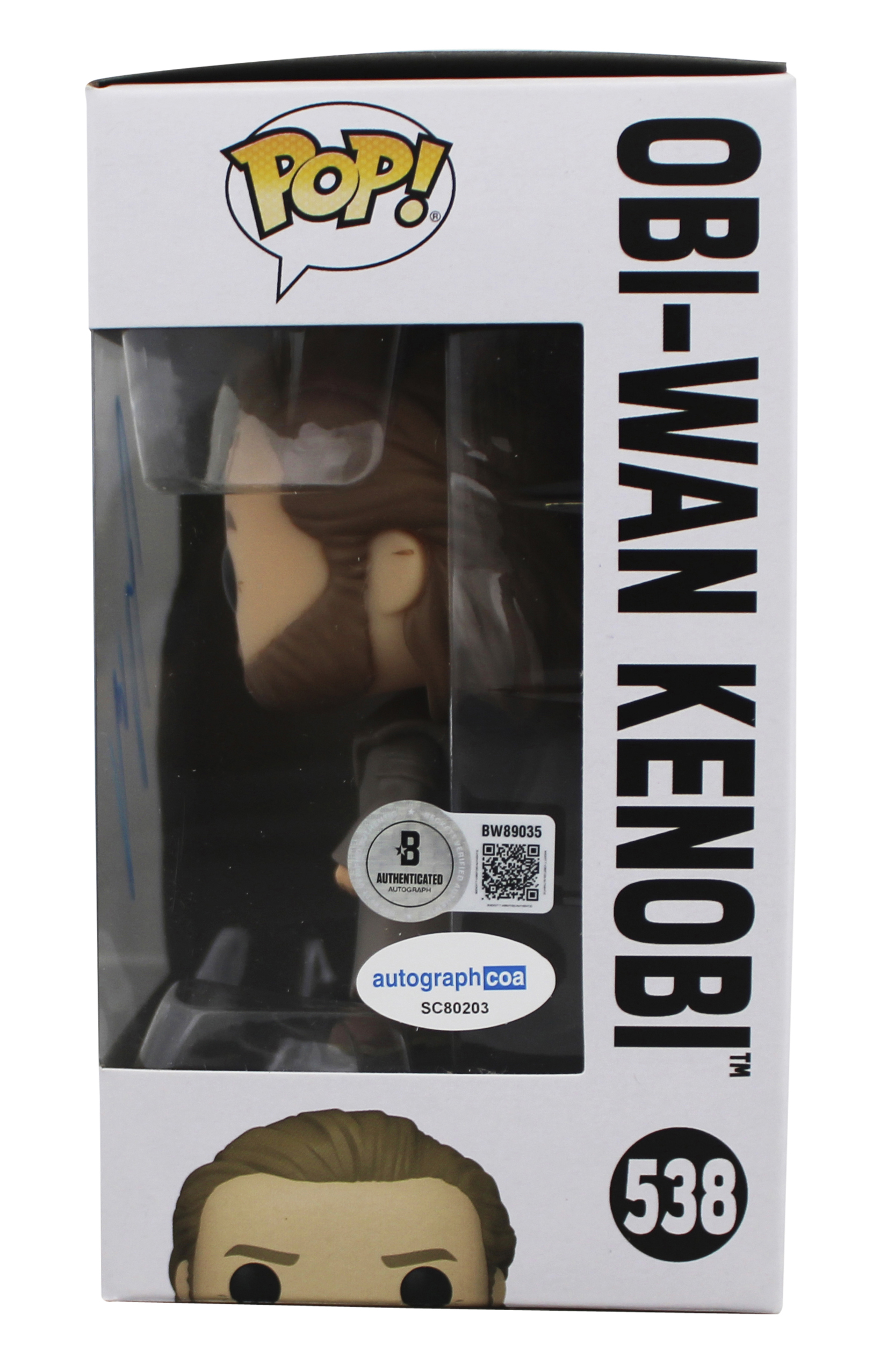 This Autographed Obi-Wan Kenobi #538 Funko Pop Vinyl Figure has been Personally Signed by Ewan McGregor of Star Wars. This item is 100% Authentic to include a hologram by Beckett Authentication Services. This item will come with an affixed Beckett Authentication Services (BAS) authentication sticker, which includes a scannable QR code to verify authenticity. Please note that Beckett no longer provides serial-numbered COA cards, and the attached BAS sticker will serve as the complete authentication for this item. The authenticity can be verified on Beckett Authentication Services website. This item will ship in a Pop! Protector, please refer to the photos for condition of the item prior to purchase, these are in good condition but would not be considered mint. There is a small tear on the bottom of this Funko's box.
