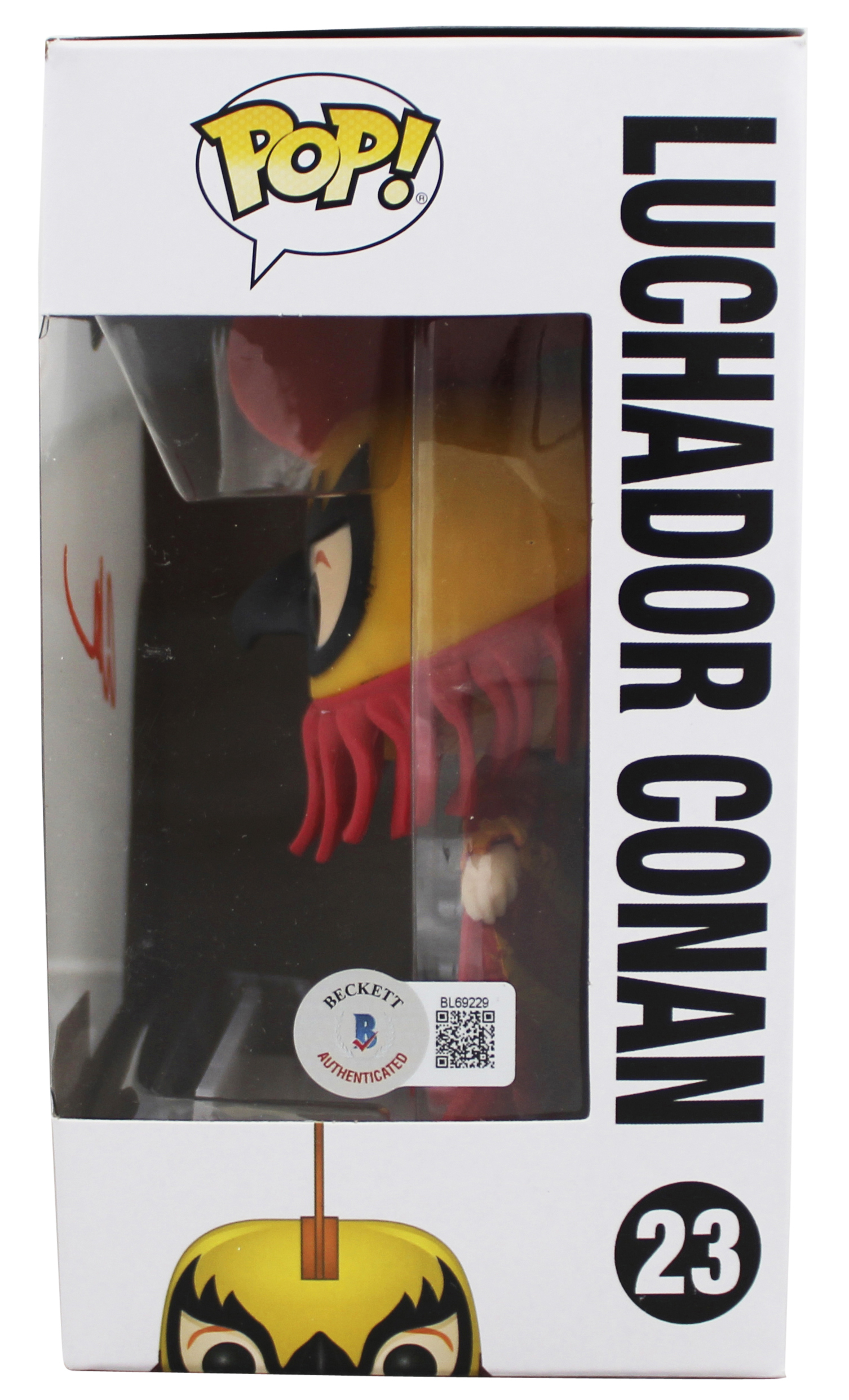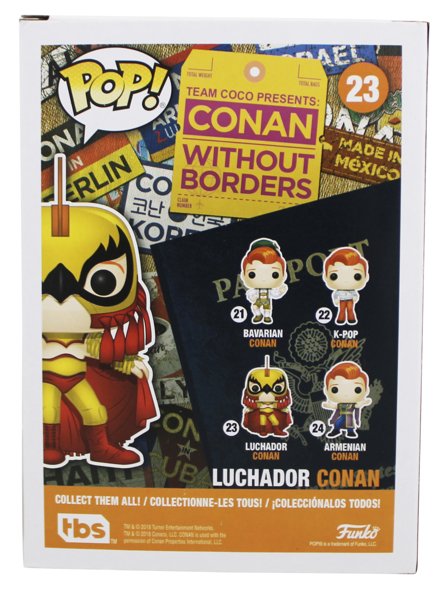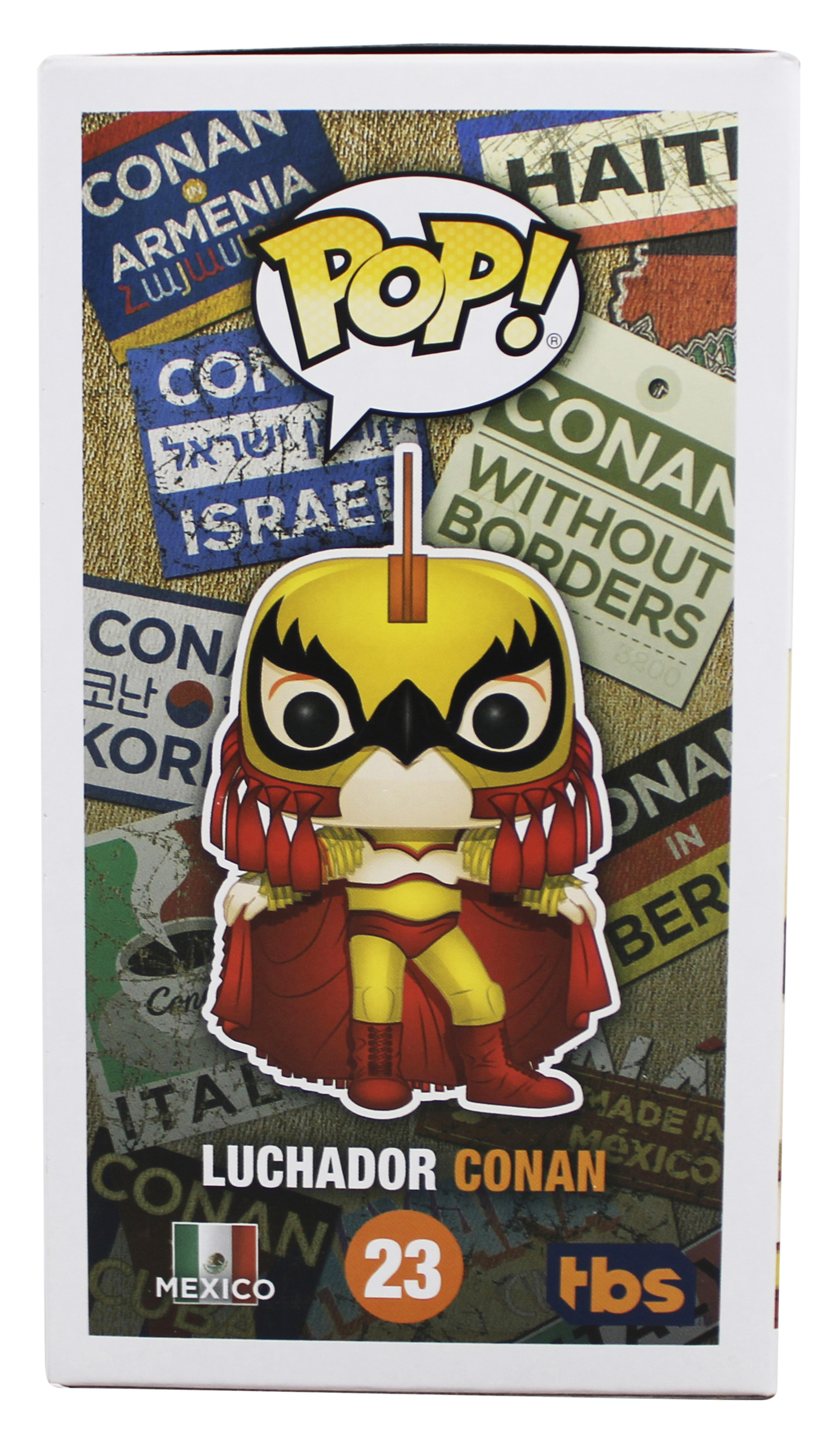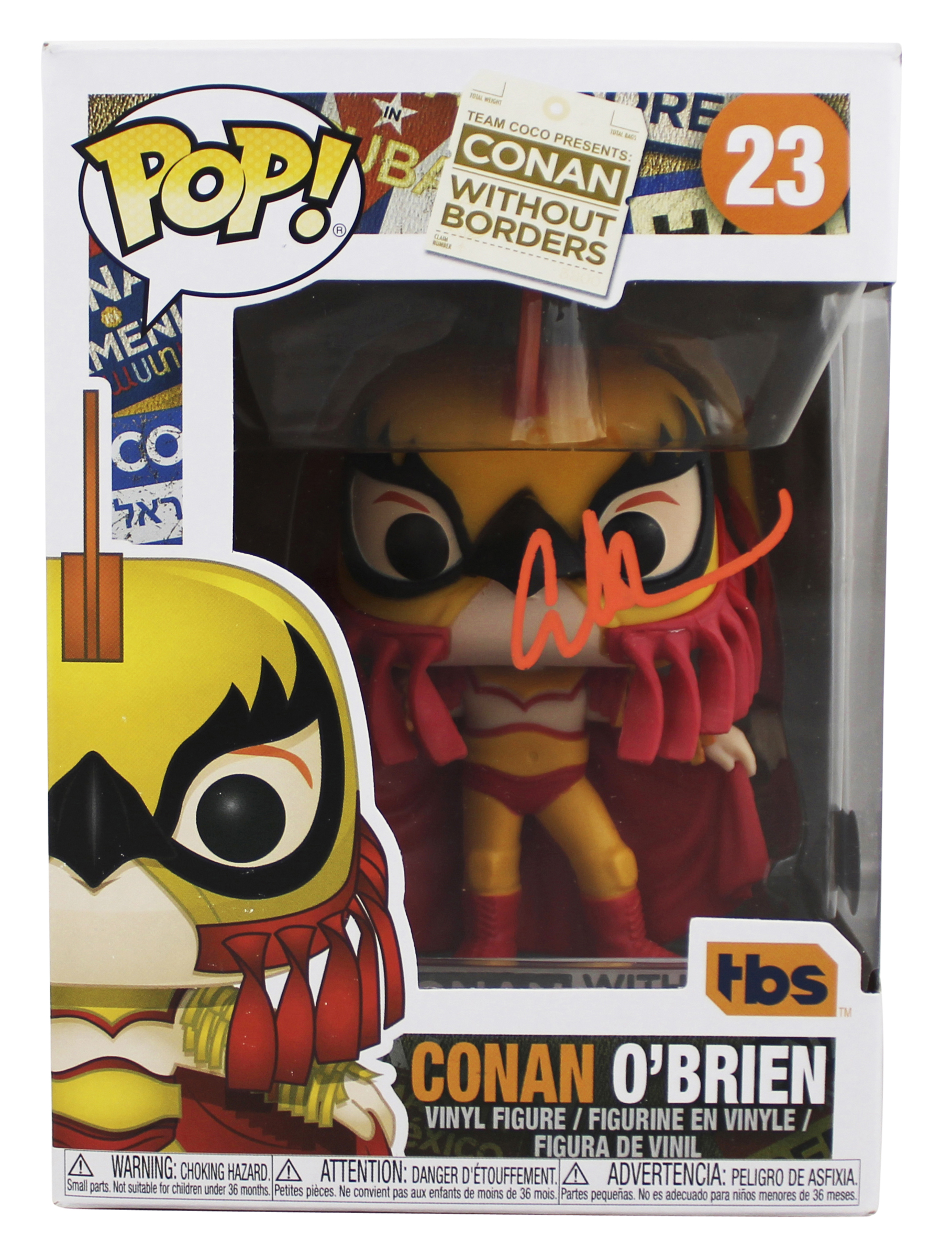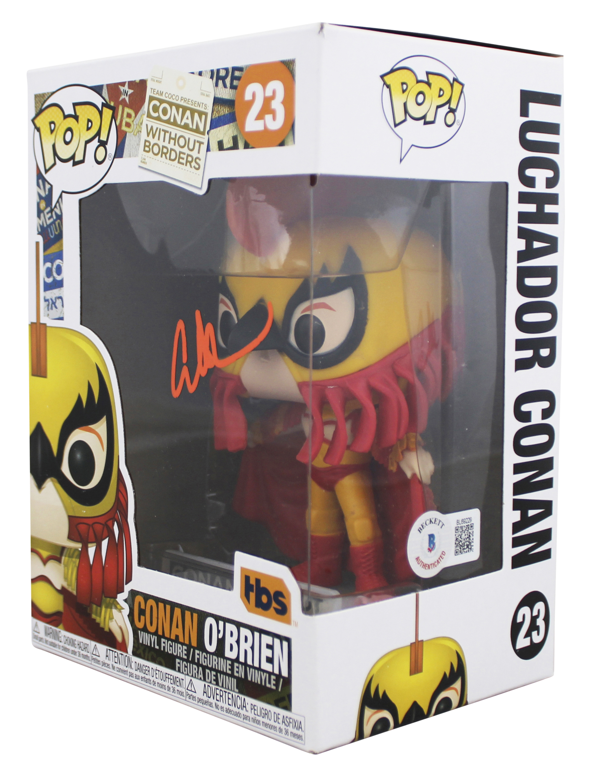 This Autographed Luchador Conan #23 Funko Pop Vinyl Figure has been Personally Signed by Conan O'Brien of Conan Without Borders. This item is 100% Authentic to include a hologram by Beckett Authentication Services. This item will come with an affixed Beckett Authentication Services (BAS) authentication sticker, which includes a scannable QR code to verify authenticity. Please note that Beckett no longer provides serial-numbered COA cards, and the attached BAS sticker will serve as the complete authentication for this item. The authenticity can be verified on Beckett Authentication Services website. This will be shipped in a Pop Protector. This Funko will have some handling wear from shipment to the signing and back. Please refer to pictures for item's condition prior to purchase.