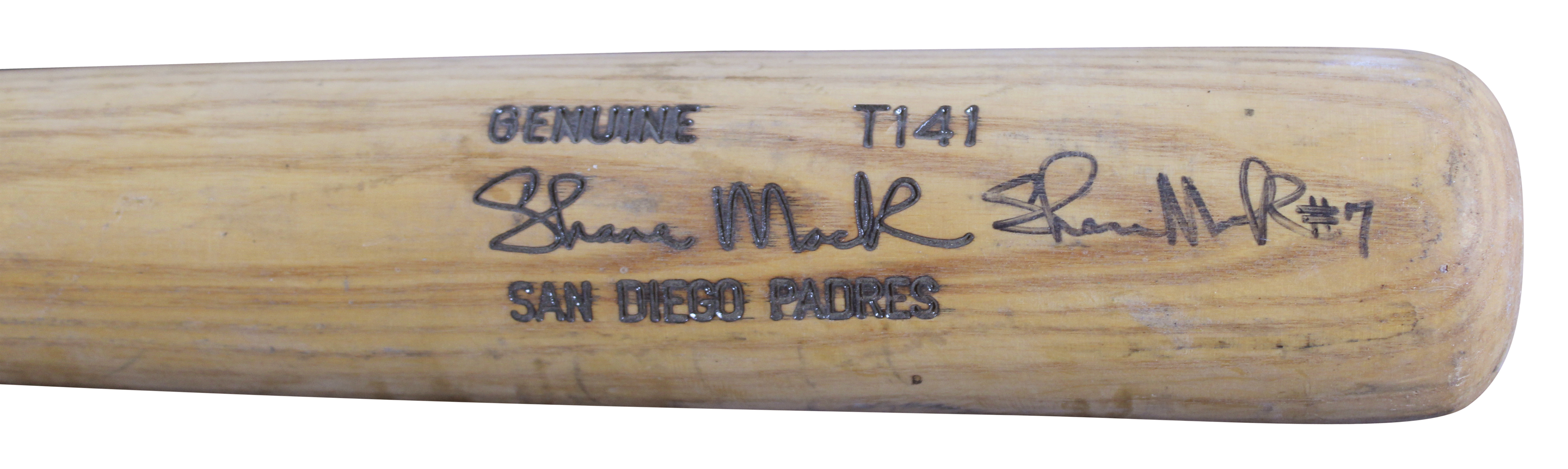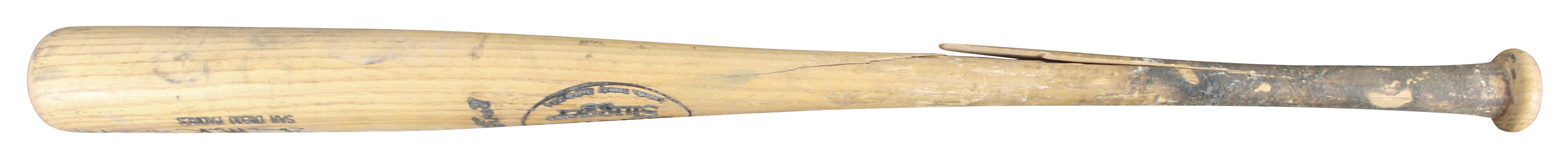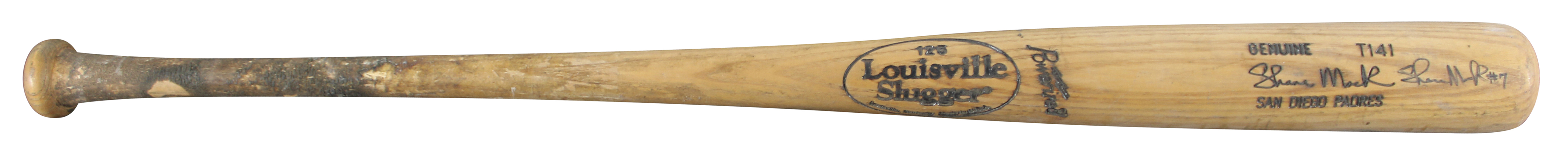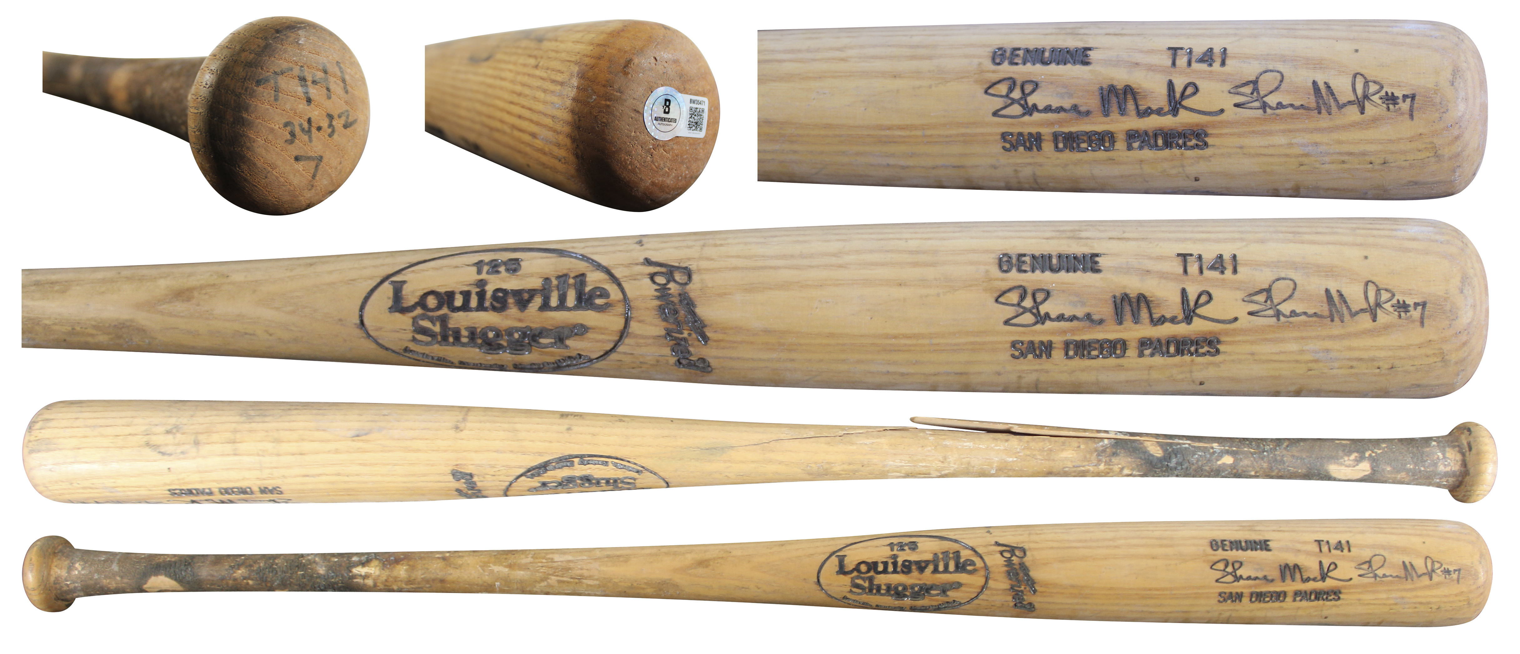 This Autographed Game Used Louisville Slugger Player Model Cracked Baseball Bat has been Personally Signed by Shane Mack of the San Diego Padres. This item is 100% Authentic to include a hologram by Beckett Authentication Services. This item will come with an affixed Beckett Authentication Services (BAS) authentication sticker, which includes a scannable QR code to verify authenticity. Please note that Beckett no longer provides serial-numbered COA cards, and the attached BAS sticker will serve as the complete authentication for this item. The authenticity can be verified on Beckett Authentication Services website. This bat does not have authentication for it being game used, however, it does match and is consistent with known exemplars from this era. This bat is cracked around the handle. Please refer to pictures for item's condition prior to purchase.