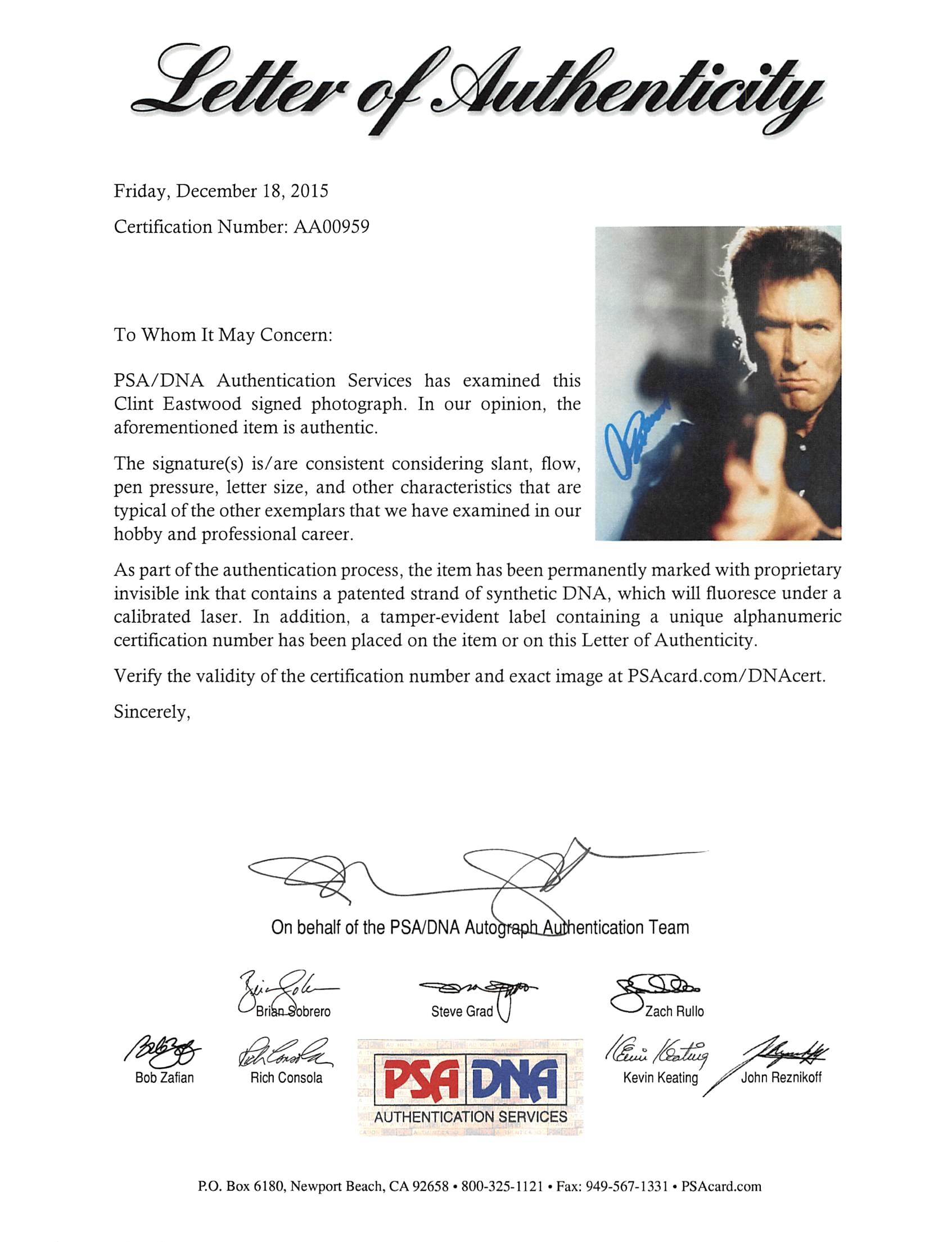 This Autographed 8x10 Photo has been Personally Signed by Clint Eastwood of Dirty Harry. This item is 100% Authentic and comes with a PSA/DNA Certification Card and a matching numbered Hologram. The authenticity can be verified on Professional Sports Authenticator website.