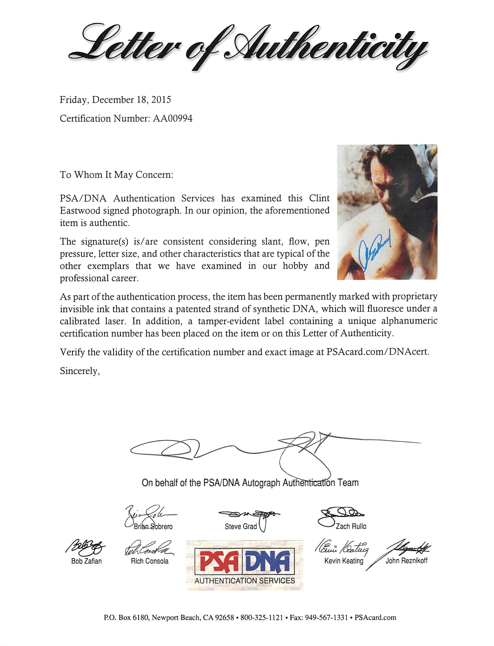 This Autographed 8x10 Photo has been Personally Signed by Clint Eastwood of The Outlaw Josey Wales. This item is 100% Authentic and comes with a PSA/DNA Certification Card and a matching numbered Hologram. The authenticity can be verified on Professional Sports Authenticator website.