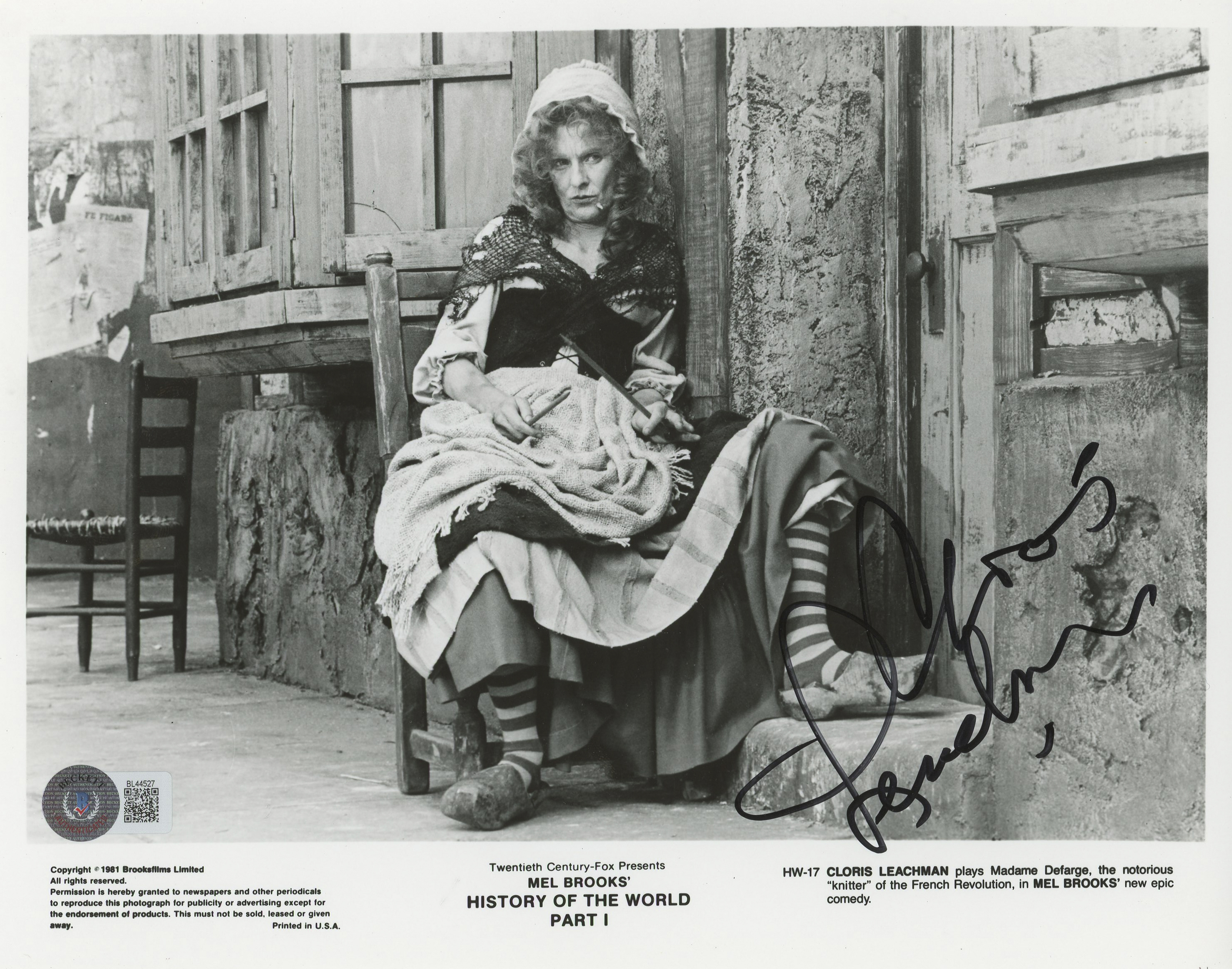 This Autographed 8x10 Photo has been Personally Signed by Cloris Leachman of History of the World: Part I. This item is 100% Authentic to include a hologram by Beckett Authentication Services. This item will come with an affixed Beckett Authentication Services (BAS) authentication sticker, which includes a scannable QR code to verify authenticity. Please note that Beckett no longer provides serial-numbered COA cards, and the attached BAS sticker will serve as the complete authentication for this item. The authenticity can be verified on Beckett Authentication Services website.