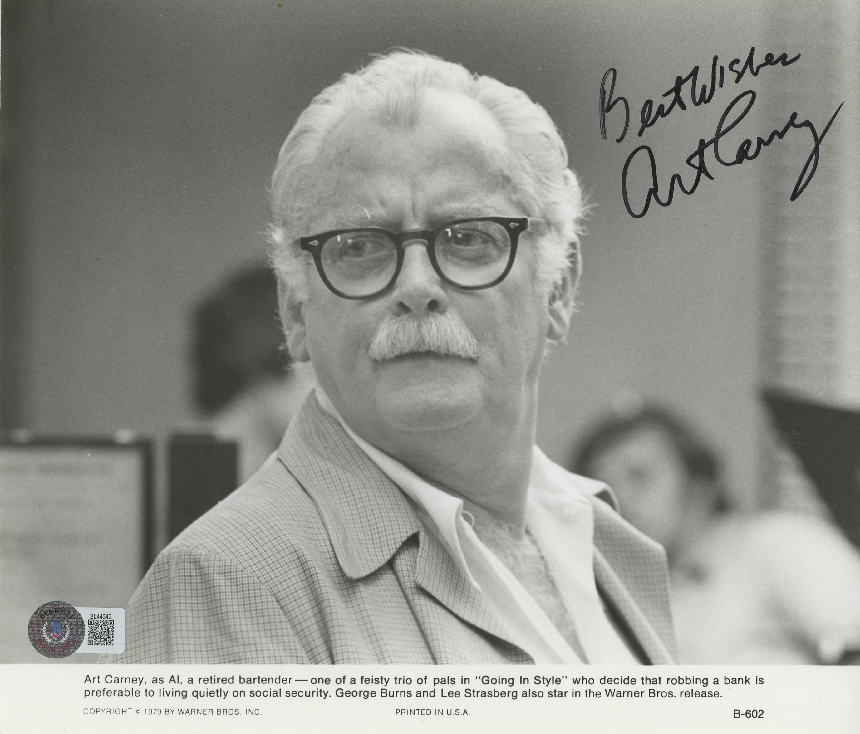 This Autographed 8x9.25 Photo has been Personally Signed by Art Carney of Going in Style. This item is 100% Authentic to include a hologram by Beckett Authentication Services. This item will come with an affixed Beckett Authentication Services (BAS) authentication sticker, which includes a scannable QR code to verify authenticity. Please note that Beckett no longer provides serial-numbered COA cards, and the attached BAS sticker will serve as the complete authentication for this item. The authenticity can be verified on Beckett Authentication Services website.
