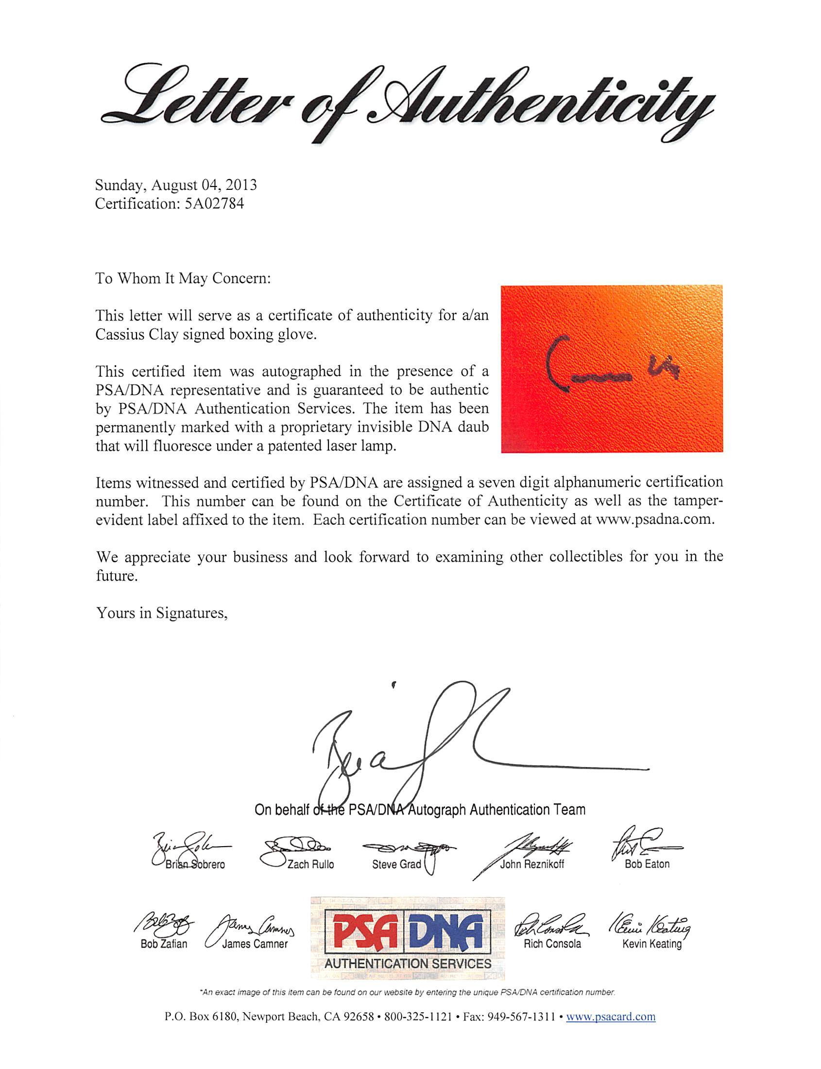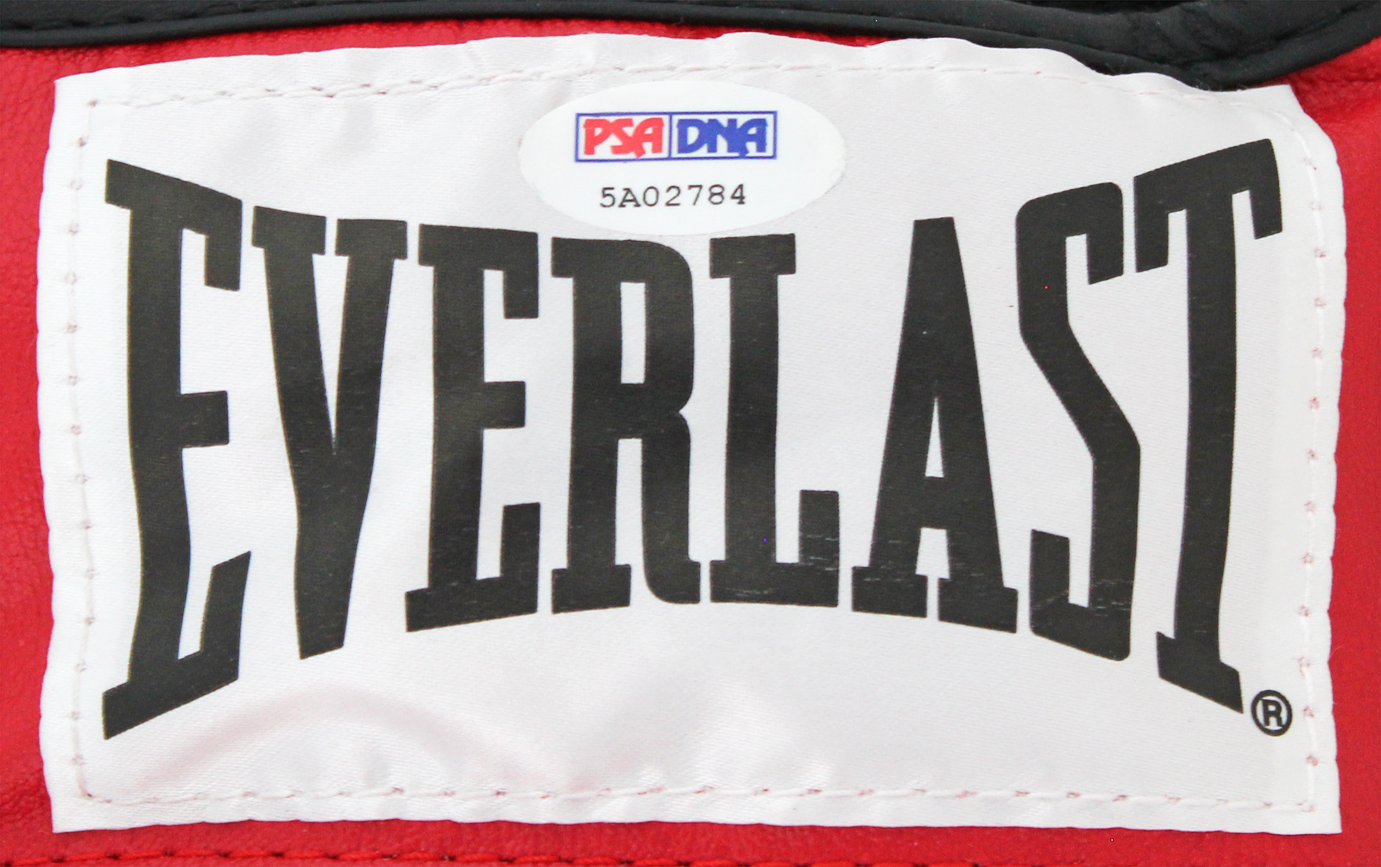 This Autographed Red Everlast Boxing Glove has been Personally Signed by Muhammad Ali "Cassius Clay". This item is 100% Authentic and comes with a PSA/DNA Certification Card and a matching numbered Hologram. This is a PSA in the Presence Authenticated item which means a PSA representative was present when this item was being signed. The authenticity can be verified on Professional Sports Authenticator website.