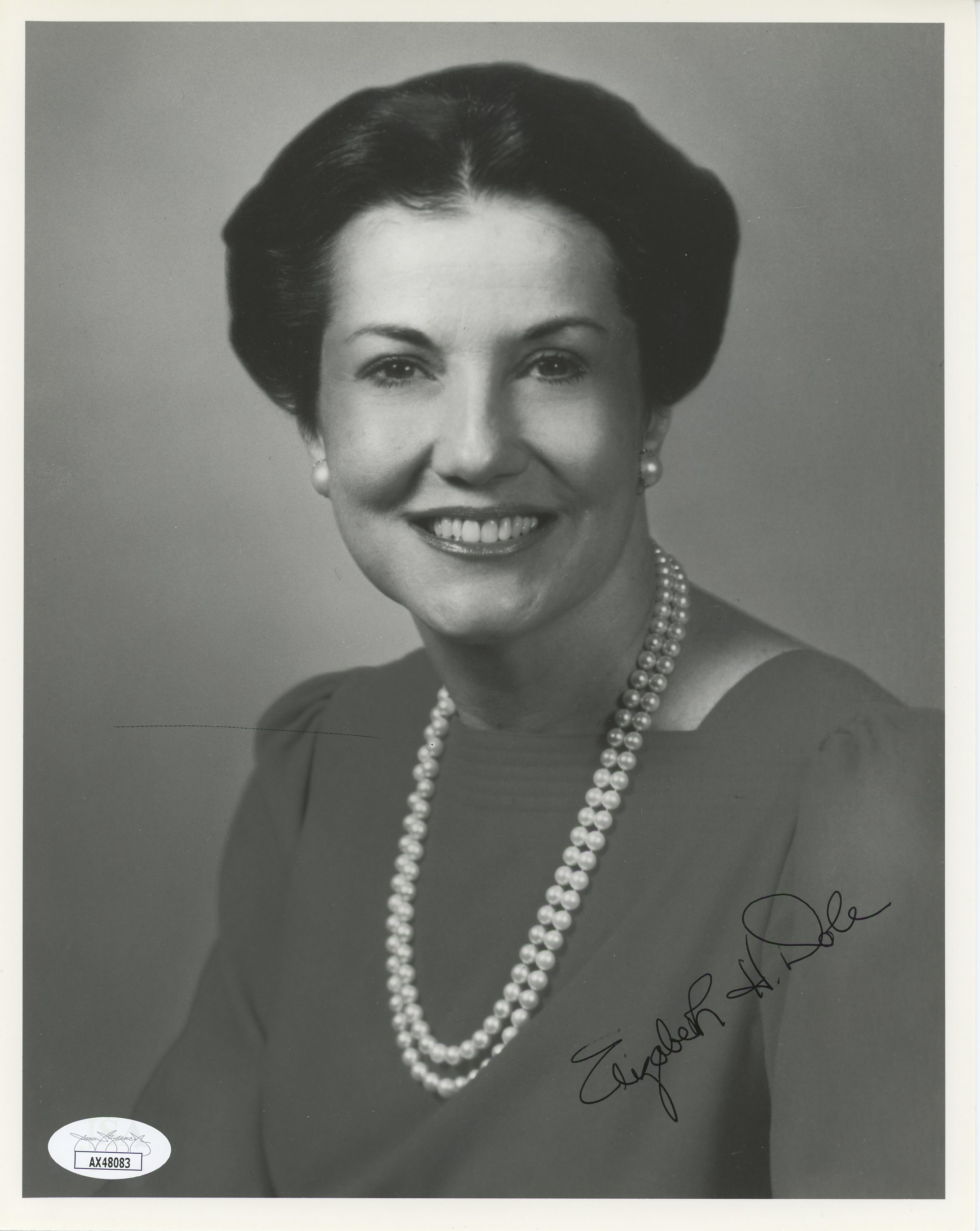 This Autographed 8x10 Photo has been Personally Signed by Elizabeth Dole. This item is 100% Authentic to include a Certificate of Authenticity (COA) / hologram by JSA. The authenticity can be verified on JSA website. This photo will have some light handling wear due to age and handling.