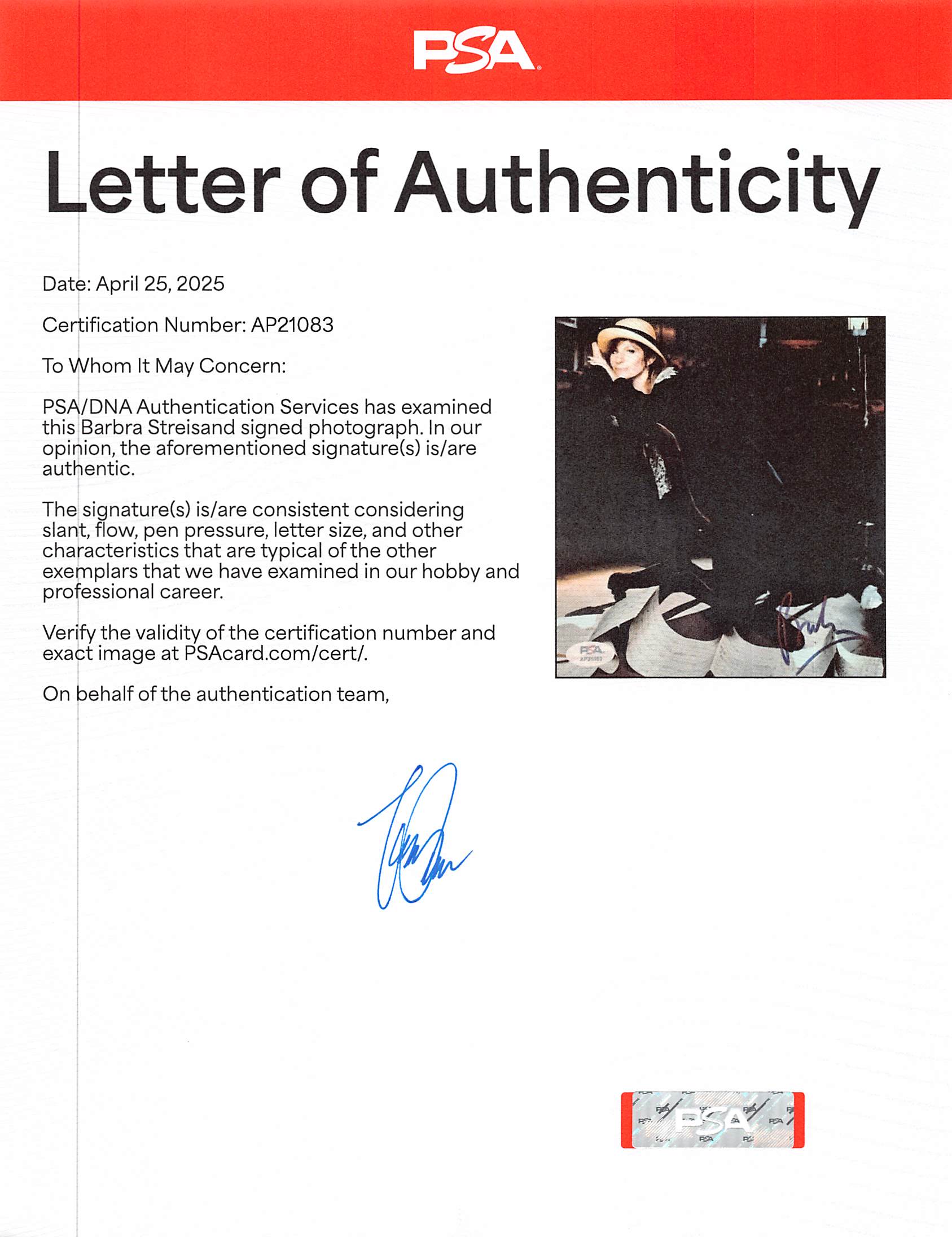 This Autographed 8x10 Photo has been Personally Signed by Barbra Streisand of Funny Girl. This item is 100% Authentic and comes with a PSA/DNA Certification numbered Hologram. Please note that PSA/DNA no longer provides serial-numbered COA cards, and the attached PSA/DNA sticker will serve as the complete authentication for this item.The authenticity can be verified on Professional Sports Authenticators website.