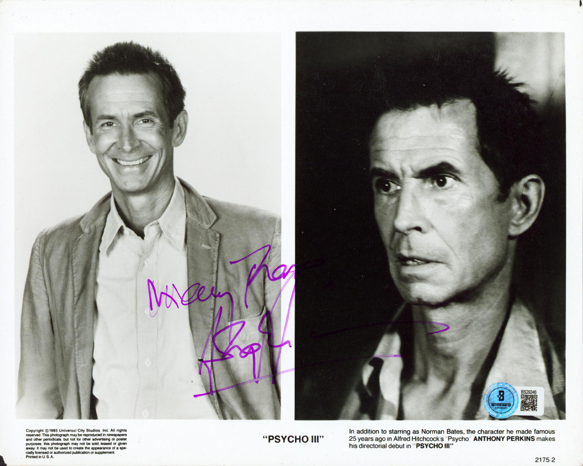 This Autographed Vertical 8x10 Black & White Photo has been Personally Signed by Anthony Perkins of Psycho III. This item is 100% Authentic to include a hologram by Beckett Authentication Services. This item will come with an affixed Beckett Authentication Services (BAS) authentication sticker, which includes a scannable QR code to verify authenticity. Please note that Beckett no longer provides serial-numbered COA cards, and the attached BAS sticker will serve as the complete authentication for this item. The authenticity can be verified on Beckett Authentication Services website. Normal handling wear is present.