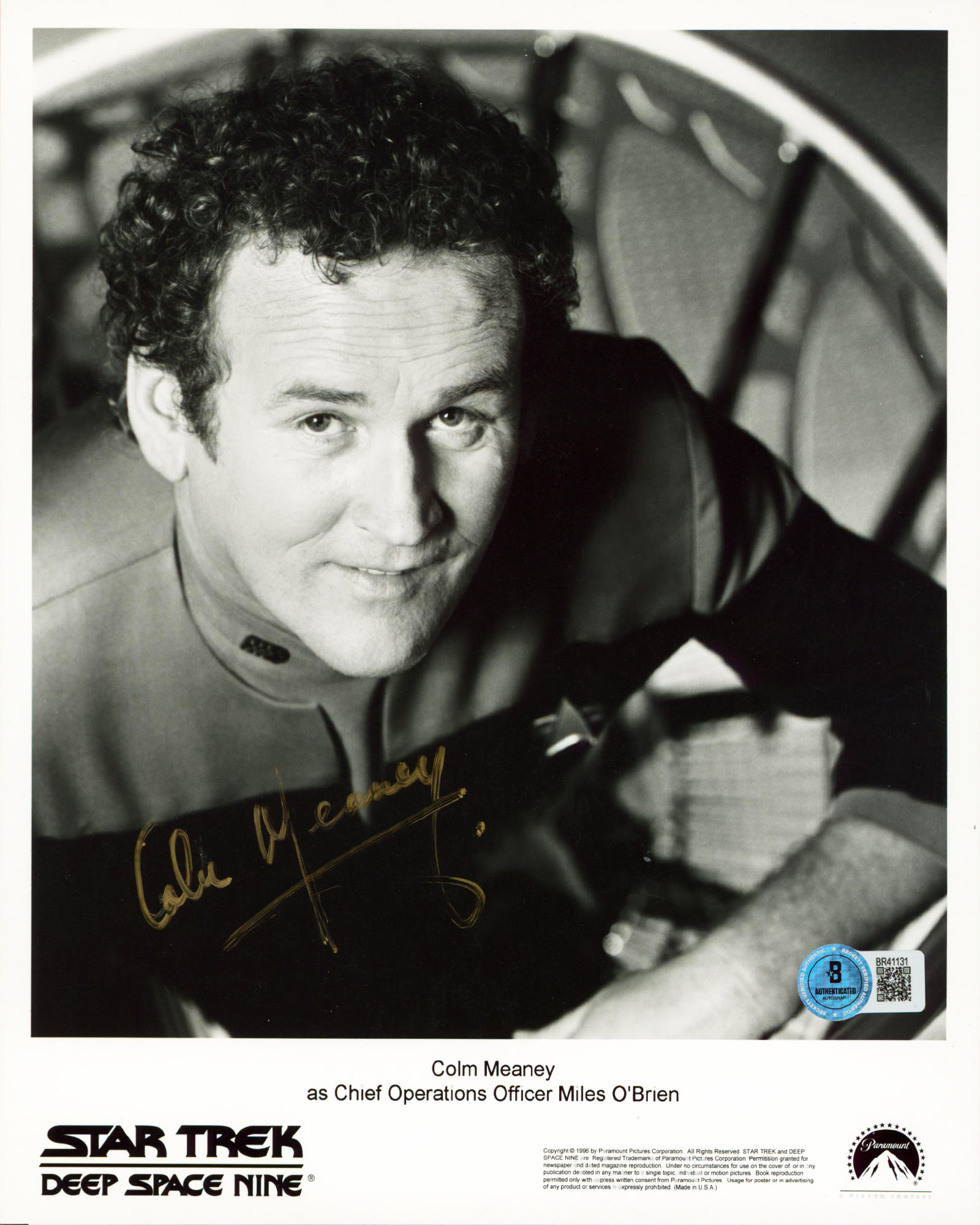 This Autographed Vertical 8x10 Photo has been Personally Signed by Colm Meaney of Star Trek Deep Space Nine. This item is 100% Authentic to include a hologram by Beckett Authentication Services. This item will come with an affixed Beckett Authentication Services (BAS) authentication sticker, which includes a scannable QR code to verify authenticity. Please note that Beckett no longer provides serial-numbered COA cards, and the attached BAS sticker will serve as the complete authentication for this item. The authenticity can be verified on Beckett Authentication Services website. Normal handling wear is present.