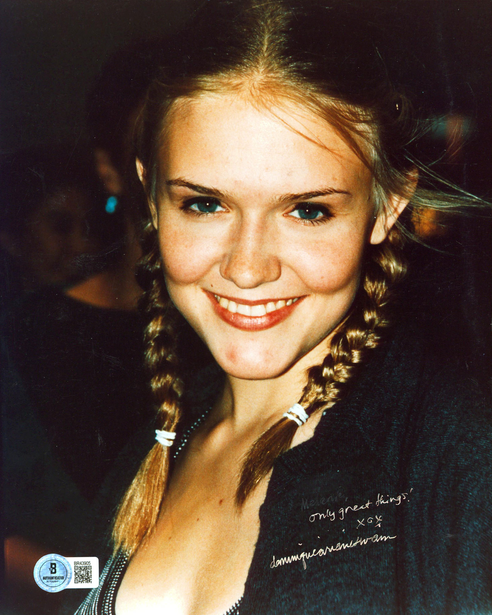 This Autographed Vertical 8x10 Photo with the inscription of "Only Great Things XOX" has been Personally Signed by Dominique Swain of Lolita. This item is 100% Authentic to include a hologram by Beckett Authentication Services. This item will come with an affixed Beckett Authentication Services (BAS) authentication sticker, which includes a scannable QR code to verify authenticity. Please note that Beckett no longer provides serial-numbered COA cards, and the attached BAS sticker will serve as the complete authentication for this item. The authenticity can be verified on Beckett Authentication Services website. Normal handling wear is present and a personalization has been removed.
