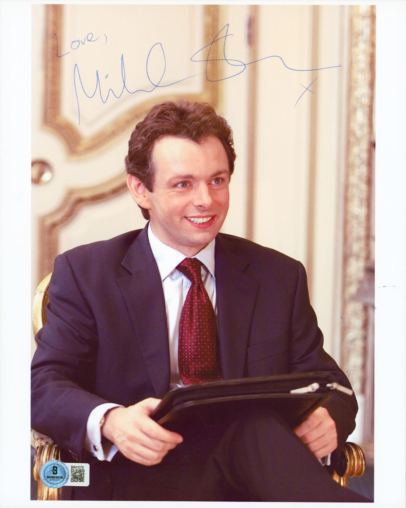 This Autographed Vertical 8.5x11 Photo with the inscription of "Love" has been Personally Signed by Michael Sheen of The Queen. This item is 100% Authentic to include a hologram by Beckett Authentication Services. This item will come with an affixed Beckett Authentication Services (BAS) authentication sticker, which includes a scannable QR code to verify authenticity. Please note that Beckett no longer provides serial-numbered COA cards, and the attached BAS sticker will serve as the complete authentication for this item. The authenticity can be verified on Beckett Authentication Services website. Normal handling wear is present.