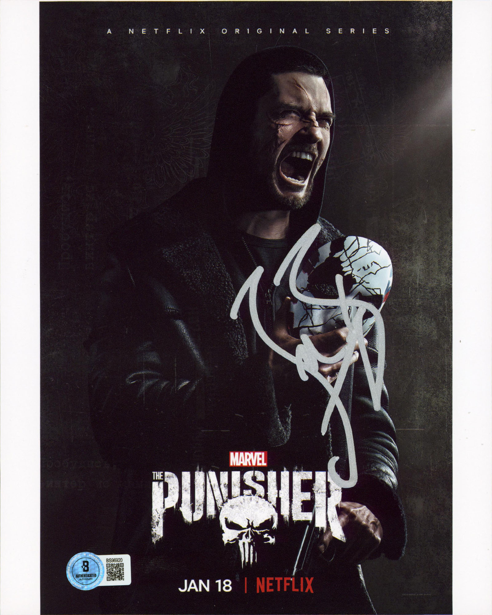 This Autographed Vertical 8x10 Photo has been Personally Signed by Ben Barnes of The Punisher. This item is 100% Authentic to include a hologram by Beckett Authentication Services. This item will come with an affixed Beckett Authentication Services (BAS) authentication sticker, which includes a scannable QR code to verify authenticity. Please note that Beckett no longer provides serial-numbered COA cards, and the attached BAS sticker will serve as the complete authentication for this item. The authenticity can be verified on Beckett Authentication Services website.