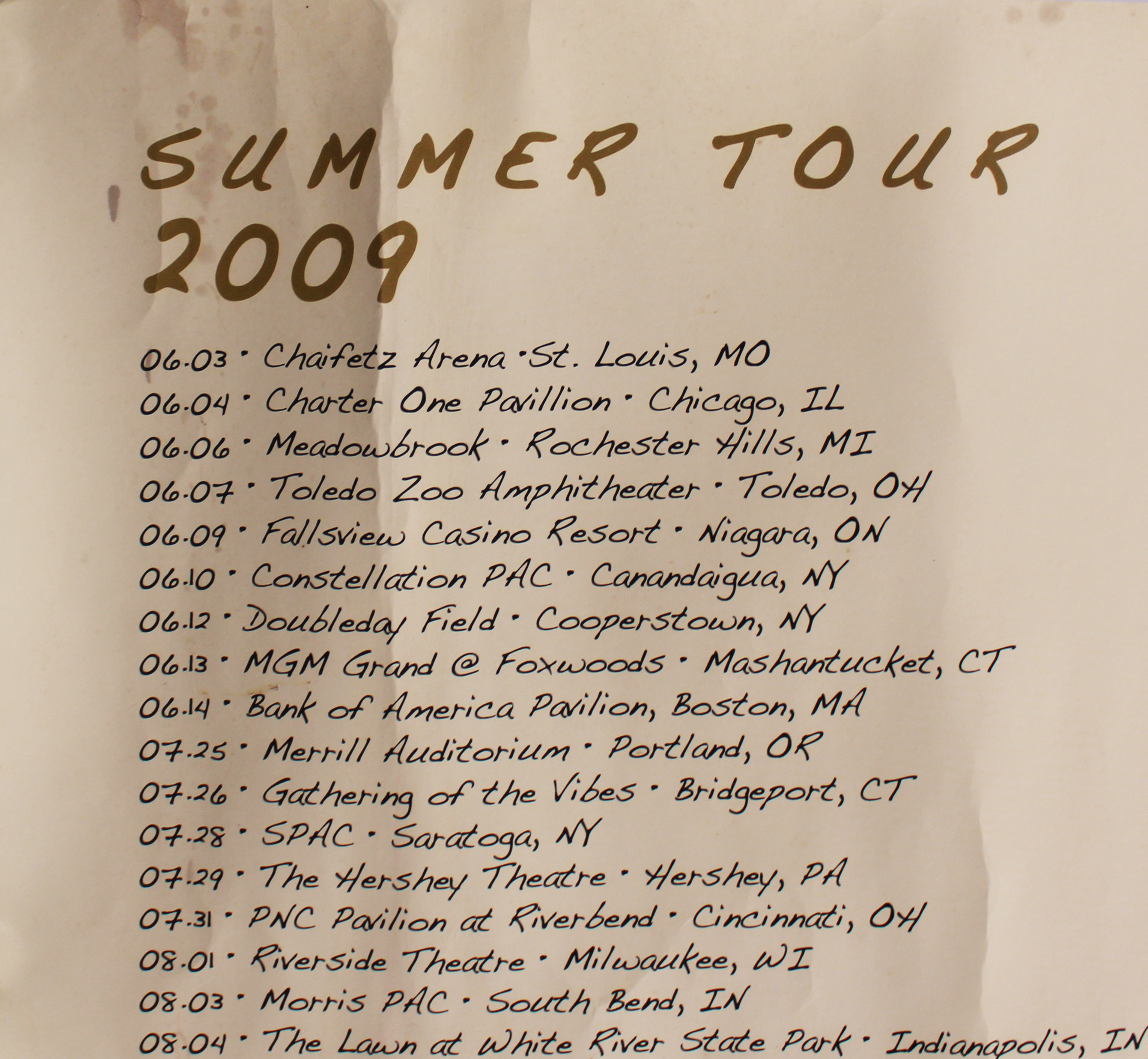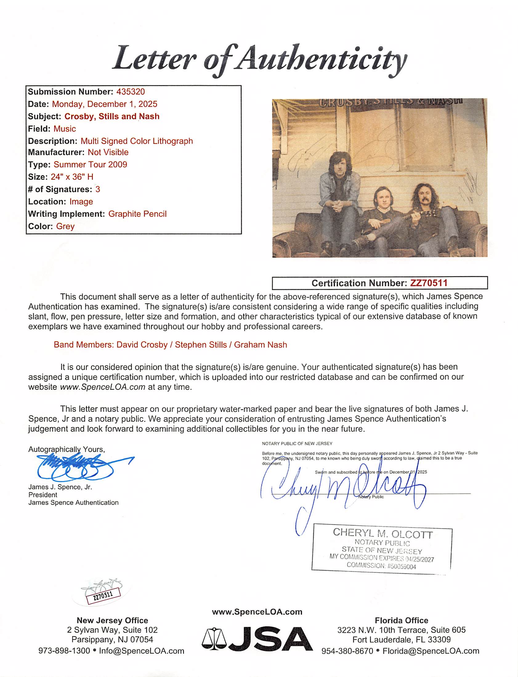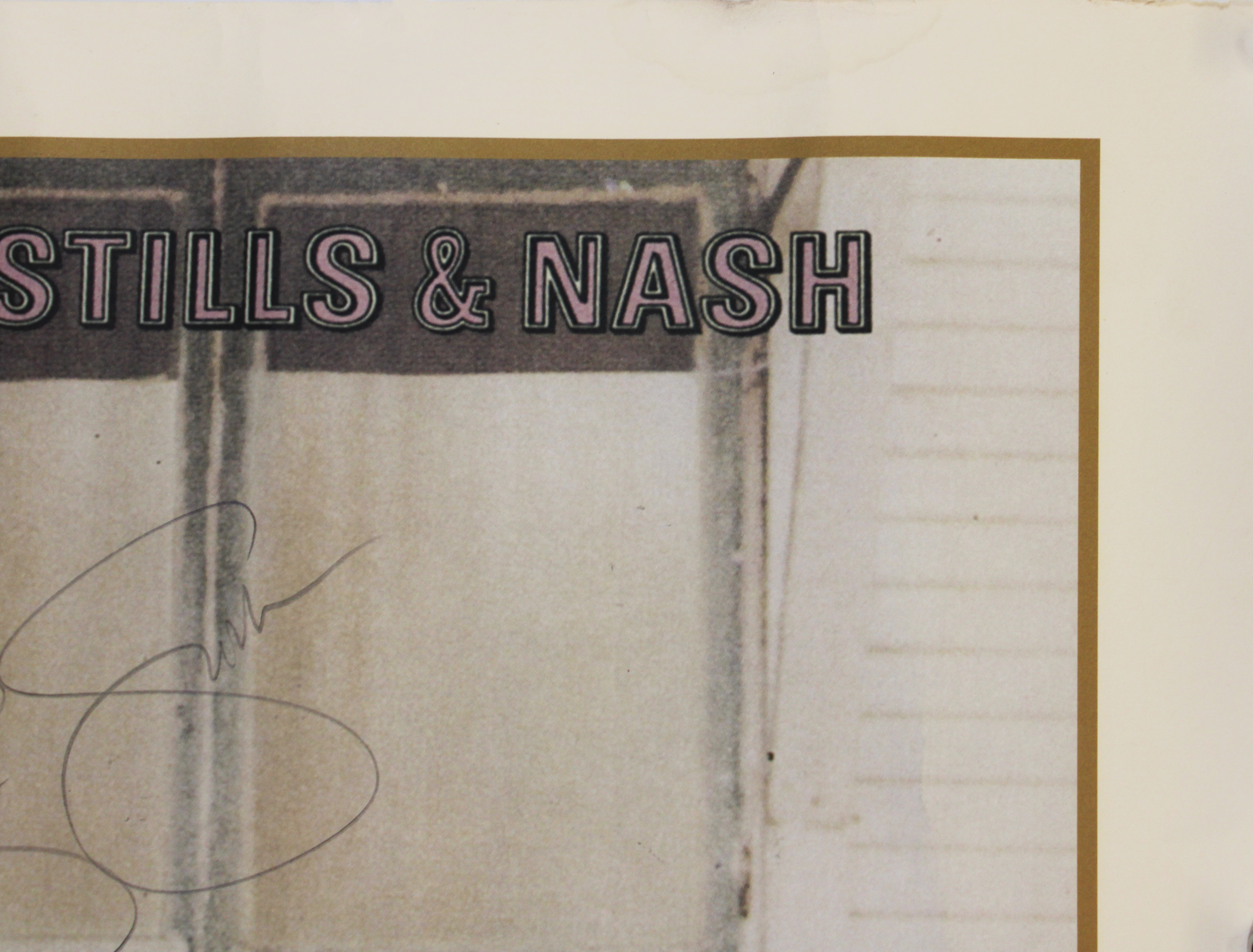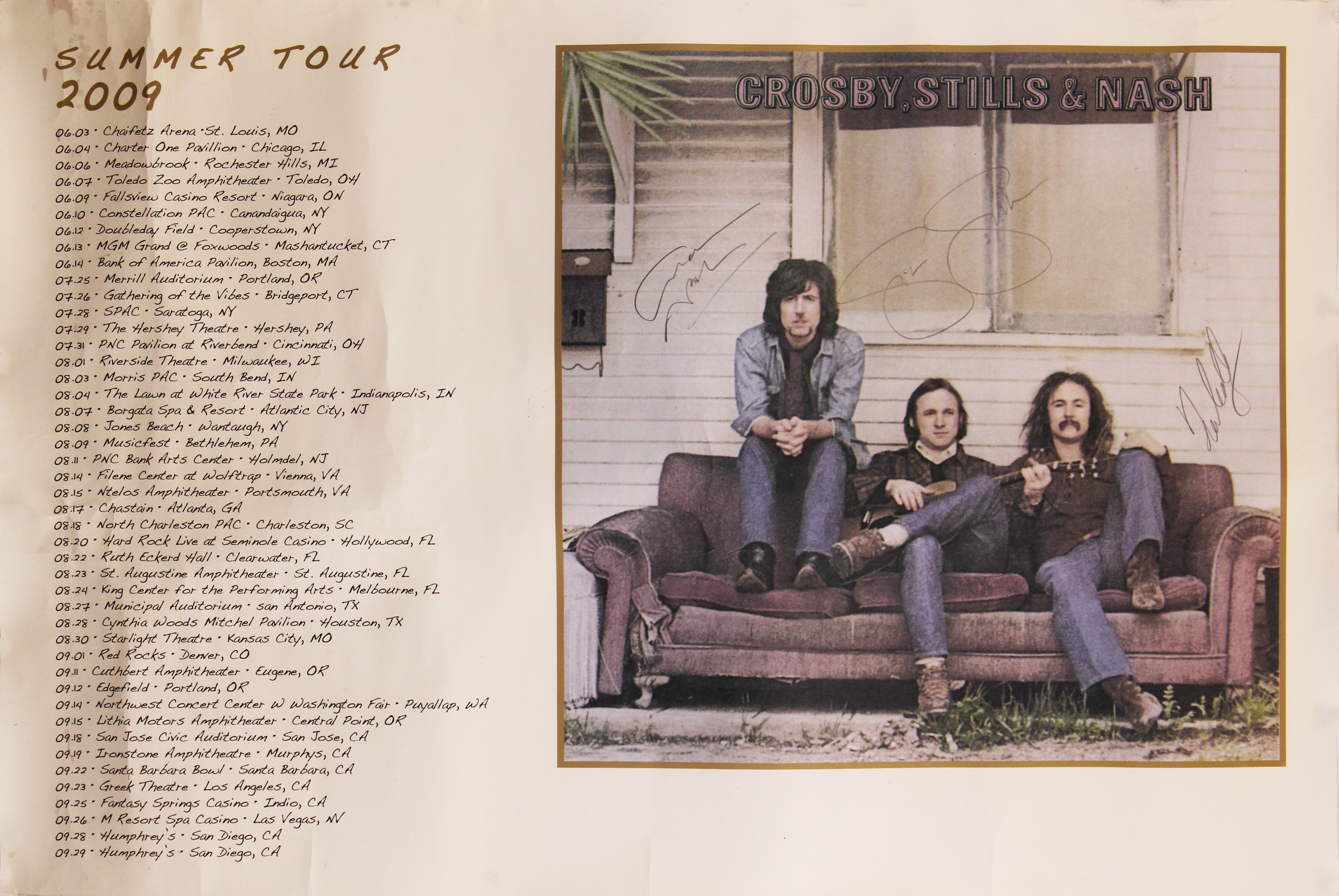 This Autographed 24x36 Summer Tour 2009 Concert Poster has been Personally Signed by David Crosby, Stephen Stills & Graham Nash of Crosby, Stills & Nash. This item is 100% Authentic to include a Certificate of Authenticity (COA) / hologram by JSA. The authenticity can be verified on JSA website. This poster has some damage from age and handling. There are some liquid stains in the top left and creases throughout the poster. Please refer to pictures for item's condition prior to purchase.