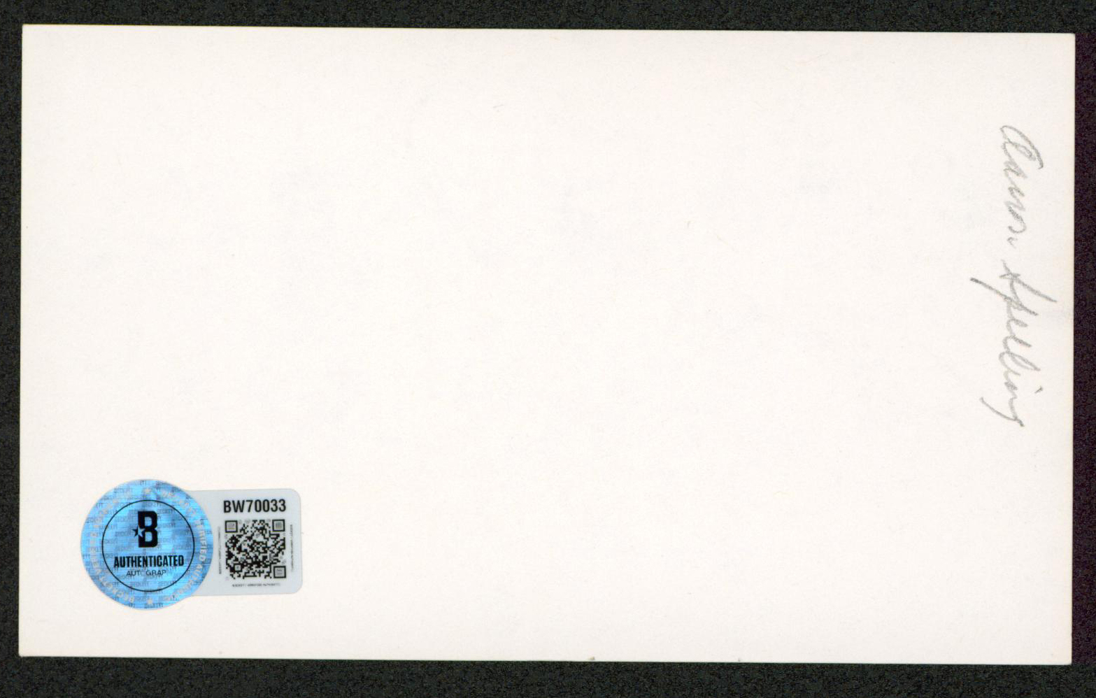 This Autographed 3x5 Index Card with the inscription of "Best" has been Personally Signed by Aaron Spelling of Charlie's Angels. This item is 100% Authentic to include a hologram by Beckett Authentication Services. This item will come with an affixed Beckett Authentication Services (BAS) authentication sticker, which includes a scannable QR code to verify authenticity. Please note that Beckett no longer provides serial-numbered COA cards, and the attached BAS sticker will serve as the complete authentication for this item. The authenticity can be verified on Beckett Authentication Services website.