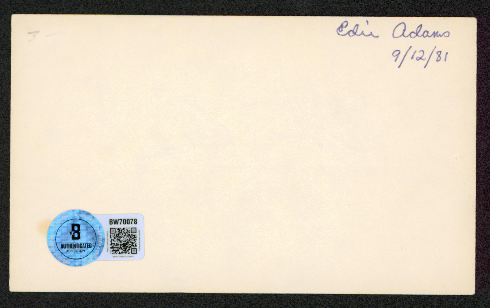 This Autographed 3x5 Index Card has been Personally Signed by Edie Adams of It's a Mad, Mad, Mad, Mad World. This item is 100% Authentic to include a hologram by Beckett Authentication Services. This item will come with an affixed Beckett Authentication Services (BAS) authentication sticker, which includes a scannable QR code to verify authenticity. Please note that Beckett no longer provides serial-numbered COA cards, and the attached BAS sticker will serve as the complete authentication for this item. The authenticity can be verified on Beckett Authentication Services website.