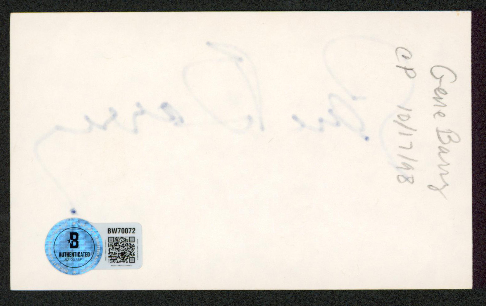 This Autographed 3x5 Index Card has been Personally Signed by Gene Barry of Bat Masterson. This item is 100% Authentic to include a hologram by Beckett Authentication Services. This item will come with an affixed Beckett Authentication Services (BAS) authentication sticker, which includes a scannable QR code to verify authenticity. Please note that Beckett no longer provides serial-numbered COA cards, and the attached BAS sticker will serve as the complete authentication for this item. The authenticity can be verified on Beckett Authentication Services website.