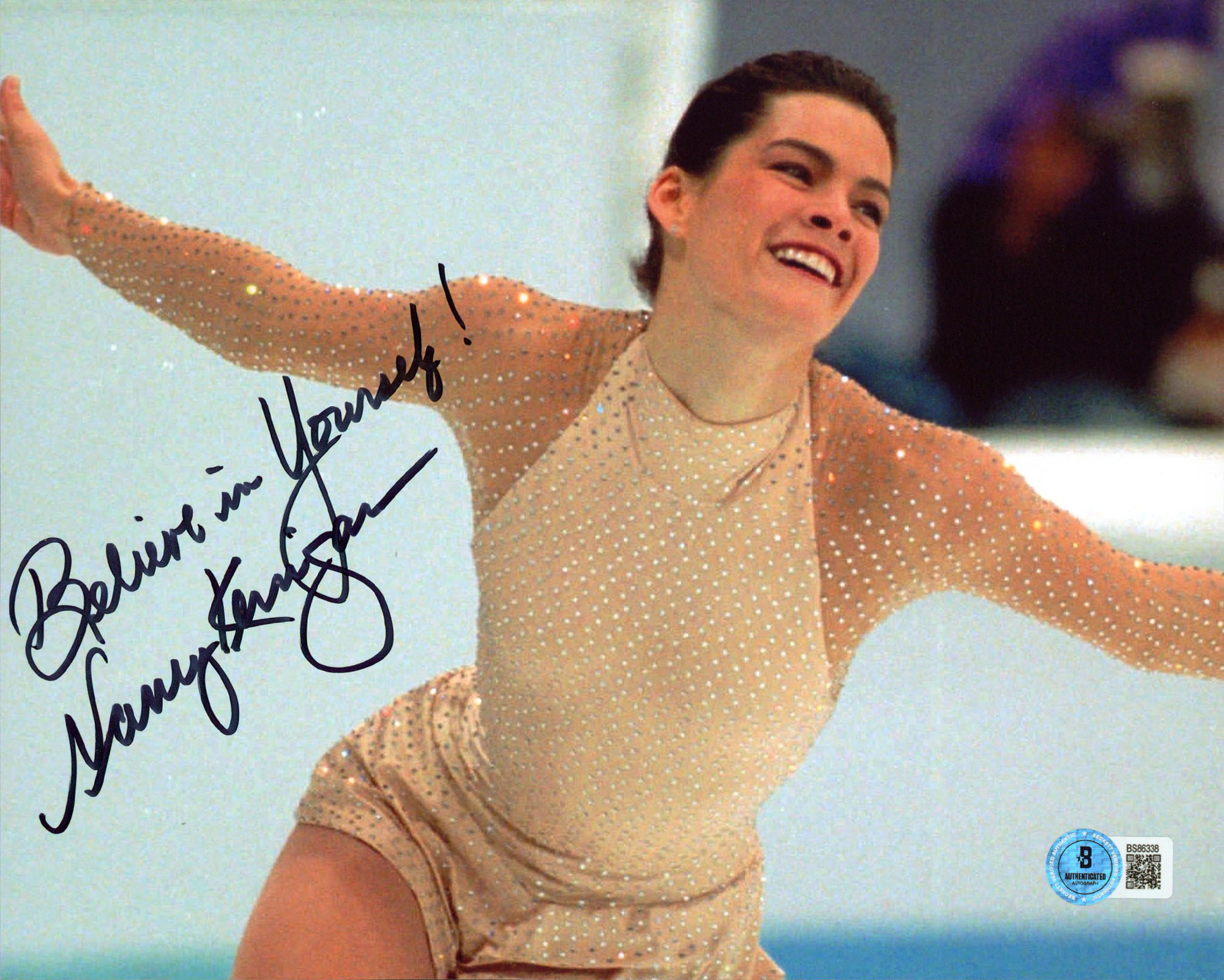 This Autographed Horizontal 8x10 Photo with the inscription of "Believe In Yourself!" has been Personally Signed by Nancy Kerrigan. This item is 100% Authentic to include a hologram by Beckett Authentication Services. This item will come with an affixed Beckett Authentication Services (BAS) authentication sticker, which includes a scannable QR code to verify authenticity. Please note that Beckett no longer provides serial-numbered COA cards, and the attached BAS sticker will serve as the complete authentication for this item. The authenticity can be verified on Beckett Authentication Services website.