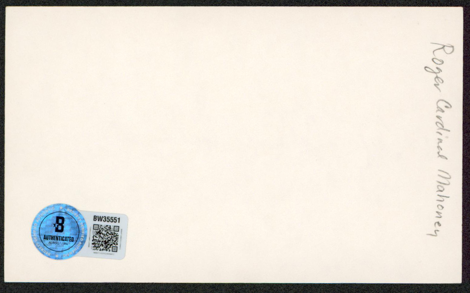 This Autographed 3x5 Index Card has been Personally Signed by Roger Cardinal Mahony. This item is 100% Authentic to include a hologram by Beckett Authentication Services. This item will come with an affixed Beckett Authentication Services (BAS) authentication sticker, which includes a scannable QR code to verify authenticity. Please note that Beckett no longer provides serial-numbered COA cards, and the attached BAS sticker will serve as the complete authentication for this item. The authenticity can be verified on Beckett Authentication Services website.