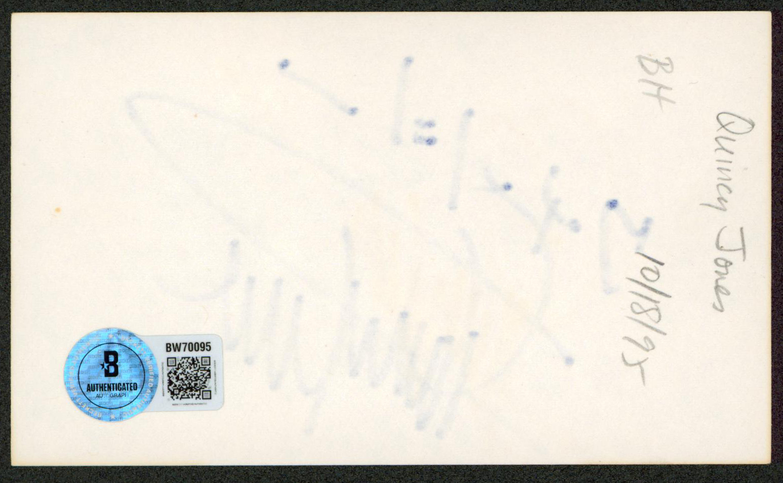 This Autographed 3x5 Index Card has been Personally Signed by Quincy Jones of The Color Purple. This item is 100% Authentic to include a hologram by Beckett Authentication Services. This item will come with an affixed Beckett Authentication Services (BAS) authentication sticker, which includes a scannable QR code to verify authenticity. Please note that Beckett no longer provides serial-numbered COA cards, and the attached BAS sticker will serve as the complete authentication for this item. The authenticity can be verified on Beckett Authentication Services website.