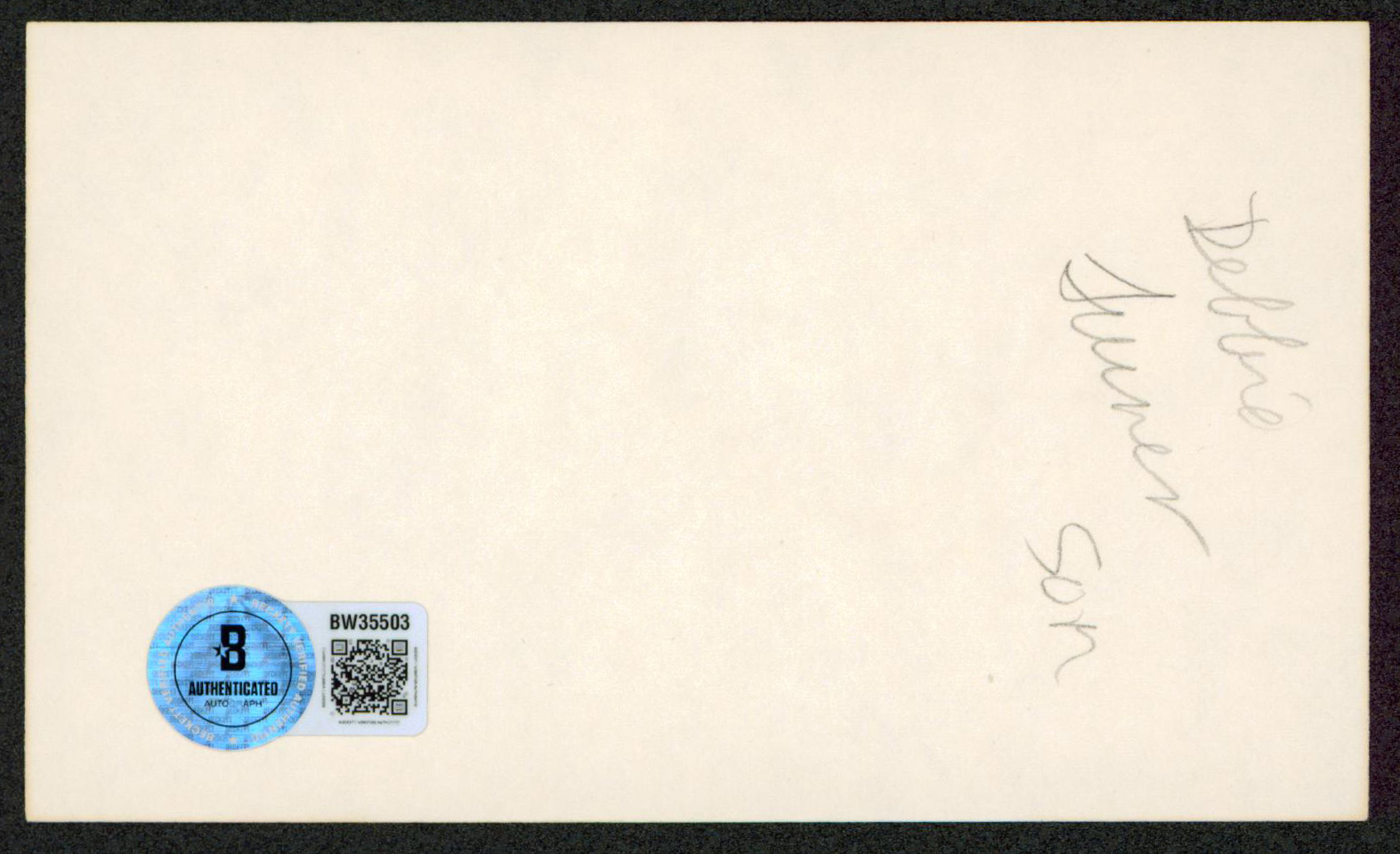 This Autographed 3x5 Index Card has been Personally Signed by Debbie Turner of The Sound Of Music. This item is 100% Authentic to include a hologram by Beckett Authentication Services. This item will come with an affixed Beckett Authentication Services (BAS) authentication sticker, which includes a scannable QR code to verify authenticity. Please note that Beckett no longer provides serial-numbered COA cards, and the attached BAS sticker will serve as the complete authentication for this item. The authenticity can be verified on Beckett Authentication Services website.