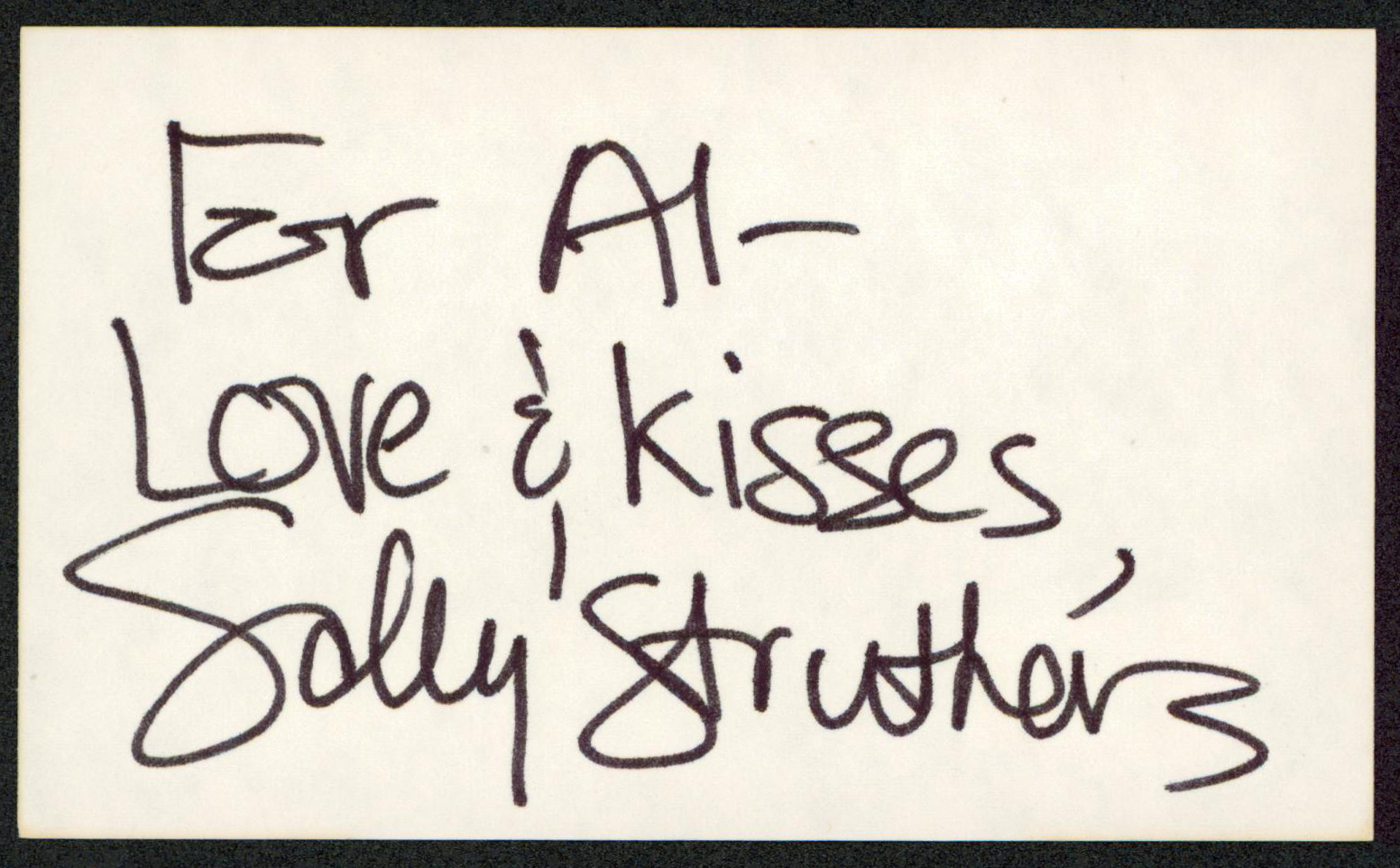 This Autographed 3x5 Index Card with the inscription of "For Al- Love & Kisses" has been Personally Signed by Sally Struthers of All In The Family. This item is 100% Authentic to include a hologram by Beckett Authentication Services. This item will come with an affixed Beckett Authentication Services (BAS) authentication sticker, which includes a scannable QR code to verify authenticity. Please note that Beckett no longer provides serial-numbered COA cards, and the attached BAS sticker will serve as the complete authentication for this item. The authenticity can be verified on Beckett Authentication Services website.
