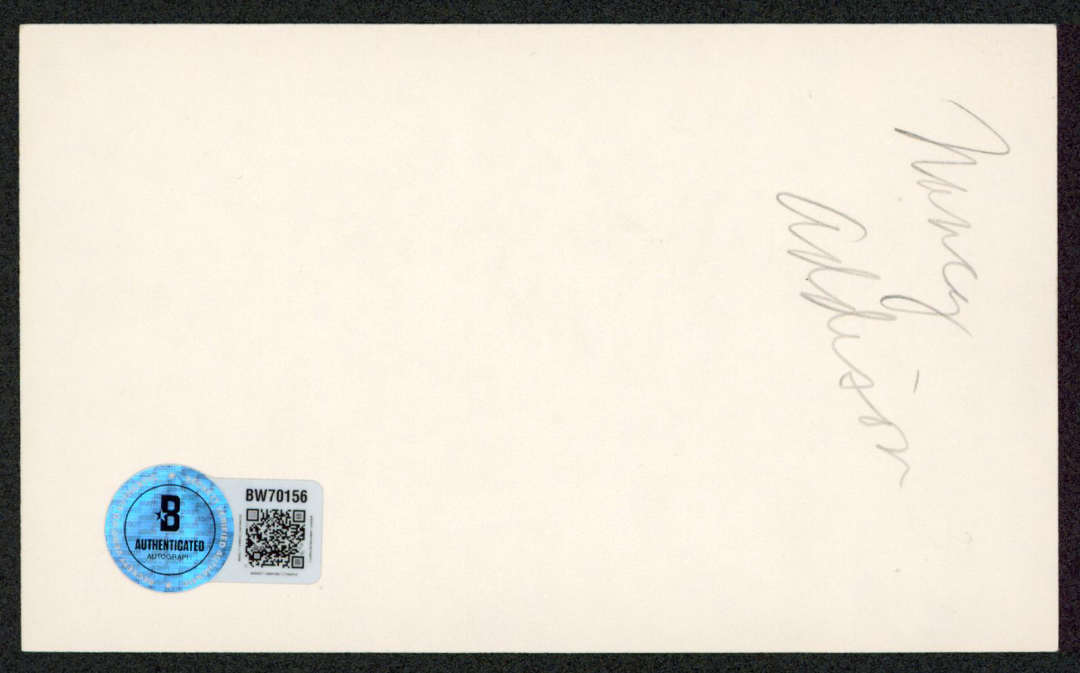 This Autographed 3x5 Index Card with the inscription of "All My Best" has been Personally Signed by Nancy Addison of Loving. This item is 100% Authentic to include a hologram by Beckett Authentication Services. This item will come with an affixed Beckett Authentication Services (BAS) authentication sticker, which includes a scannable QR code to verify authenticity. Please note that Beckett no longer provides serial-numbered COA cards, and the attached BAS sticker will serve as the complete authentication for this item. The authenticity can be verified on Beckett Authentication Services website.