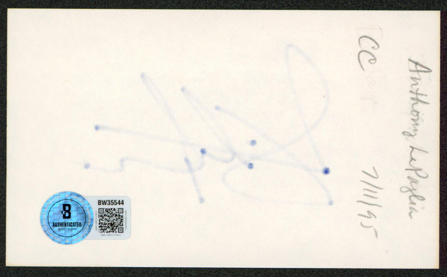 This Autographed 3x5 Index Card has been Personally Signed by Anthony LaPaglia of Without a Trace. This item is 100% Authentic to include a hologram by Beckett Authentication Services. This item will come with an affixed Beckett Authentication Services (BAS) authentication sticker, which includes a scannable QR code to verify authenticity. Please note that Beckett no longer provides serial-numbered COA cards, and the attached BAS sticker will serve as the complete authentication for this item. The authenticity can be verified on Beckett Authentication Services website.