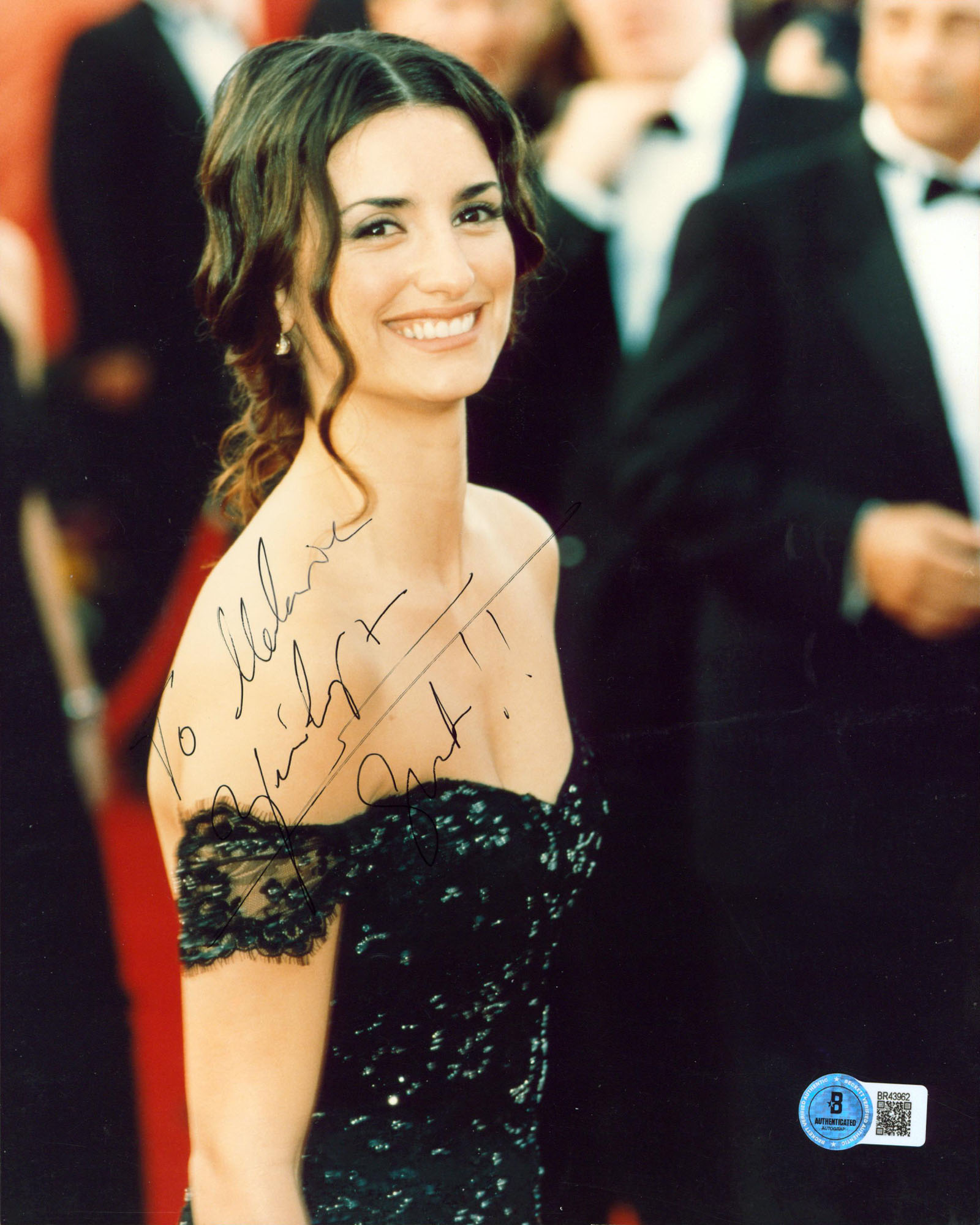 This Autographed Vertical 8x10 Photo with the inscription of "To Melanie" has been Personally Signed by Penelope Cruz of Vanilla Sky. This item is 100% Authentic to include a hologram by Beckett Authentication Services. This item will come with an affixed Beckett Authentication Services (BAS) authentication sticker, which includes a scannable QR code to verify authenticity. Please note that Beckett no longer provides serial-numbered COA cards, and the attached BAS sticker will serve as the complete authentication for this item. The authenticity can be verified on Beckett Authentication Services website. Normal handling wear is present.