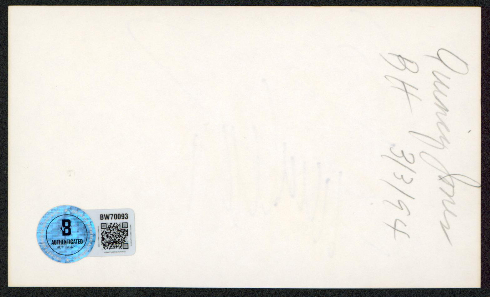 This Autographed 3x5 Index Card has been Personally Signed by Quincy Jones of The Color Purple. This item is 100% Authentic to include a hologram by Beckett Authentication Services. This item will come with an affixed Beckett Authentication Services (BAS) authentication sticker, which includes a scannable QR code to verify authenticity. Please note that Beckett no longer provides serial-numbered COA cards, and the attached BAS sticker will serve as the complete authentication for this item. The authenticity can be verified on Beckett Authentication Services website.