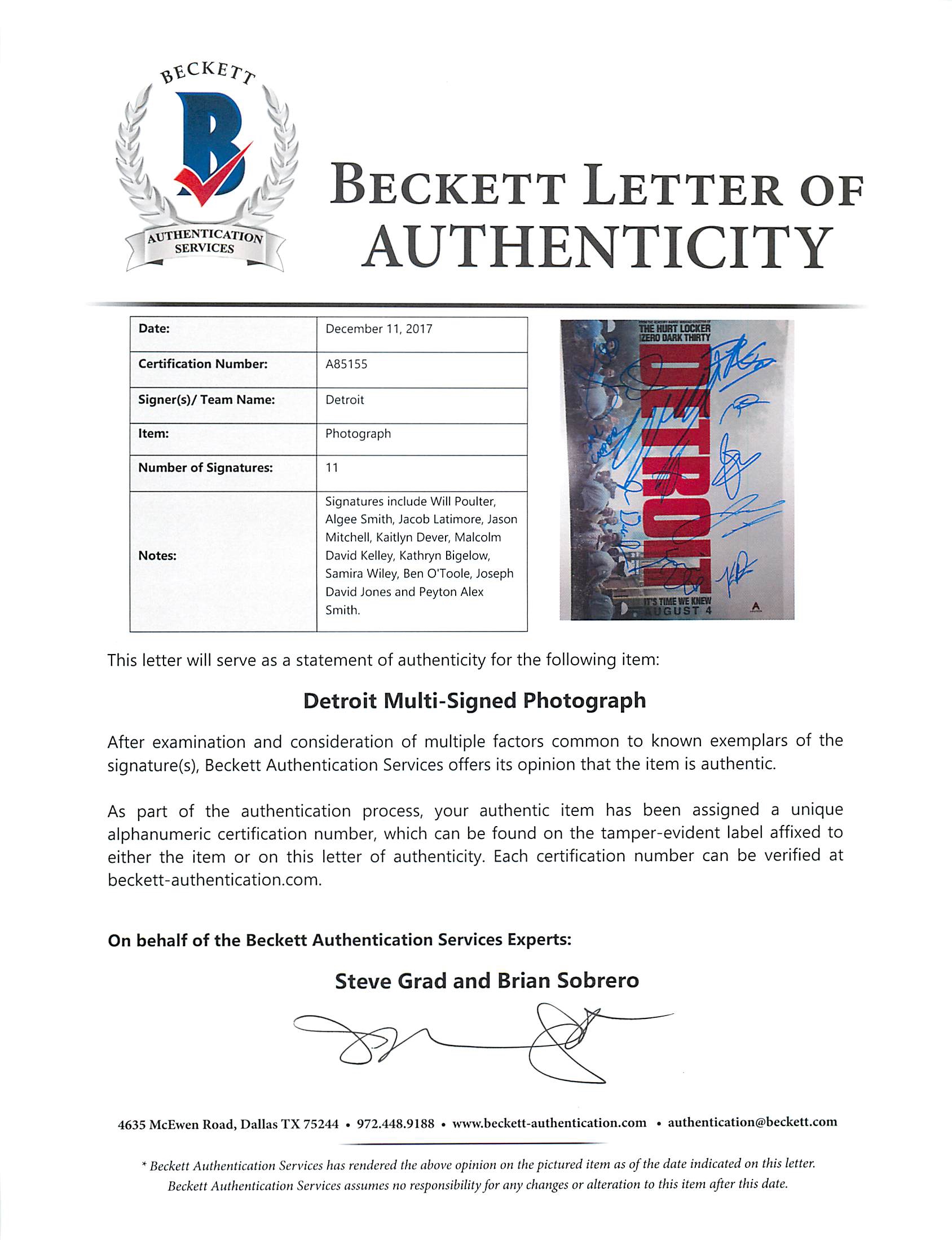 This Autographed 11x14 Photo has been Personally Signed by Kathryn Bigelow, Will Poulter, Algee Smith, Jacob Latimore, Jason Mitchell, Kaitlyn Dever, Malcom David Kelley, Samira Wiley, Ben O'Toole, Joseph David Jones & Peyton Alex Smith of Detroit. This item is 100% Authentic to include a Certificate of Authenticity (COA) / hologram by Beckett Authentication Services.The authenticity can be verified on Beckett Authentication Services website. Press Pass Collectibles only offers Authentic Autographs by Kathryn Bigelow, Will Poulter, Algee Smith, Jacob Latimore, Jason Mitchell, Kaitlyn Dever, Malcom David Kelley, Samira Wiley, Ben O'Toole, Joseph David Jones & Peyton Alex Smith through Signings, In-Person Signings or Private Collections to include a 100% money back Lifetime Authenticity Guarantee.