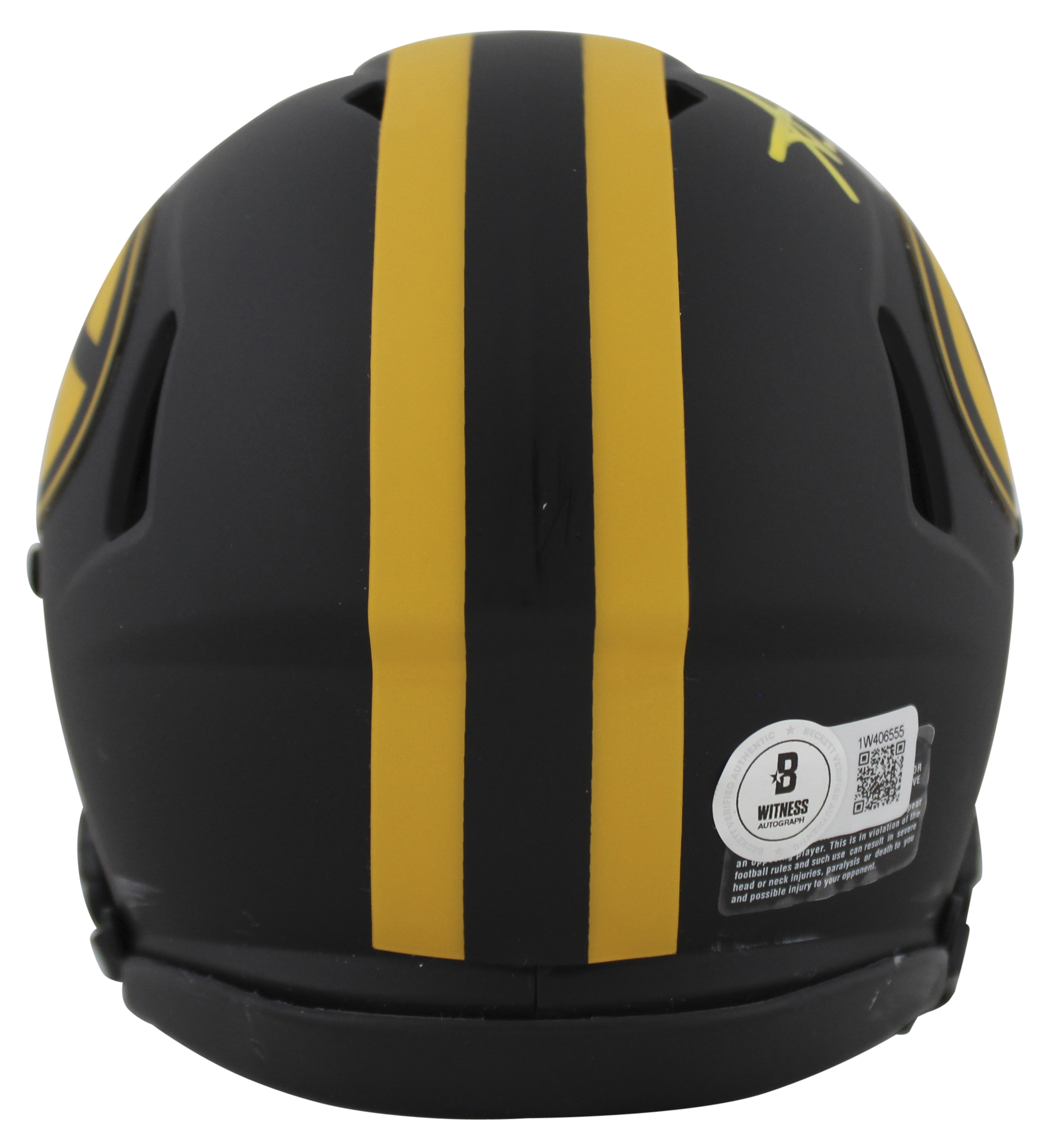 This Autographed Alternate Eclipse Speed Mini Helmet has been Personally Signed by Aaron Jones of the Green Bay Packers. This item is 100% Authentic to include a hologram by Beckett Authentication Services. This item may come with the new Beckett Authentication hologram that has a scannable QR code rather than the traditional COA. If you would like to have a COA, you are welcome to reach out to Beckett for a printed certification once you receive your item. This is a BAS Witnessed Protection Program item which means a Beckett Authentication Service representative was present when this item was being signed. We conducted an autograph signing with Aaron Jones where multiples of the same item were signed. While the photographs are representative of this item, the size, placement and strength of the signature may vary. Each item is hand signed, therefore, each autograph is unique. This item can be verified through BAS Witnessed.