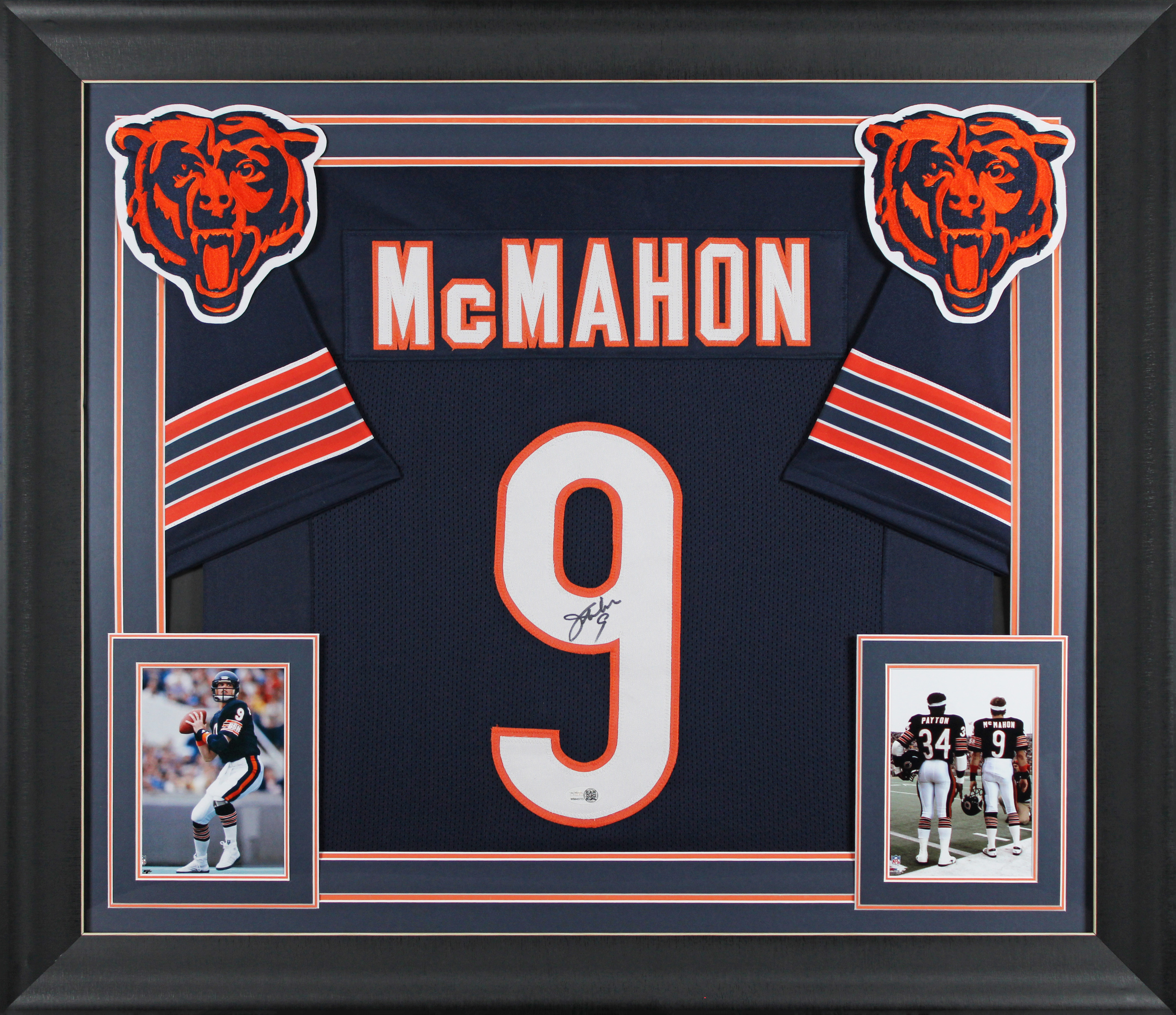 This Autographed Navy Pro Style Framed Jersey has been Personally Signed by Jim McMahon of the Chicago Bears. This item is 100% Authentic to include a hologram by James Spence Authentication Services. This item will come with an affixed James Spence Authentication Services (JSA) authentication sticker, which includes a scannable QR code to verify authenticity. Please note that JSA no longer provides serial-numbered COA cards with witnessed items, and the attached JSA sticker will serve as the complete authentication for this item. This is a JSA Witnessed Protection Program item which means a JSA representative was present when this item was being signed. We conducted an autograph signing with Jim McMahon where multiples of the same item were signed. While the photographs are representative of this item, the size, placement and strength of the signature may vary. Each item is hand signed, therefore, each autograph is unique. This item can be verified through JSA Witness. This item has been professionally framed to overall dimensions of approximately 32 x 37 inches. This is a X-Large sized, non-branded, custom-stitched Framed Jersey. This jersey will be framed to order, it will take approximately 4-5 business days from purchase date before it will ship.